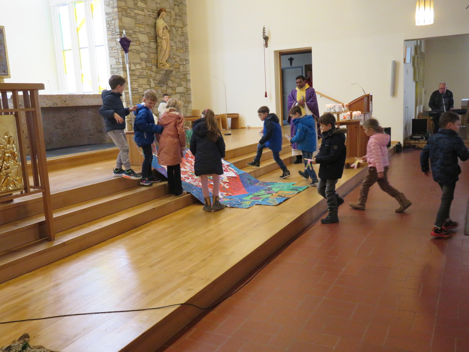 Vor Beginn der Osterferien feierten die katholischen Schüler aller Klassen gemeinsam mit P. Jomon, den Lehrkräften und einigen Eltern und Großeltern, einen von Religionslehrerin Rebecca Amring Genave gemeinsam mit den Kindern gestalteten Gottesdienst.
