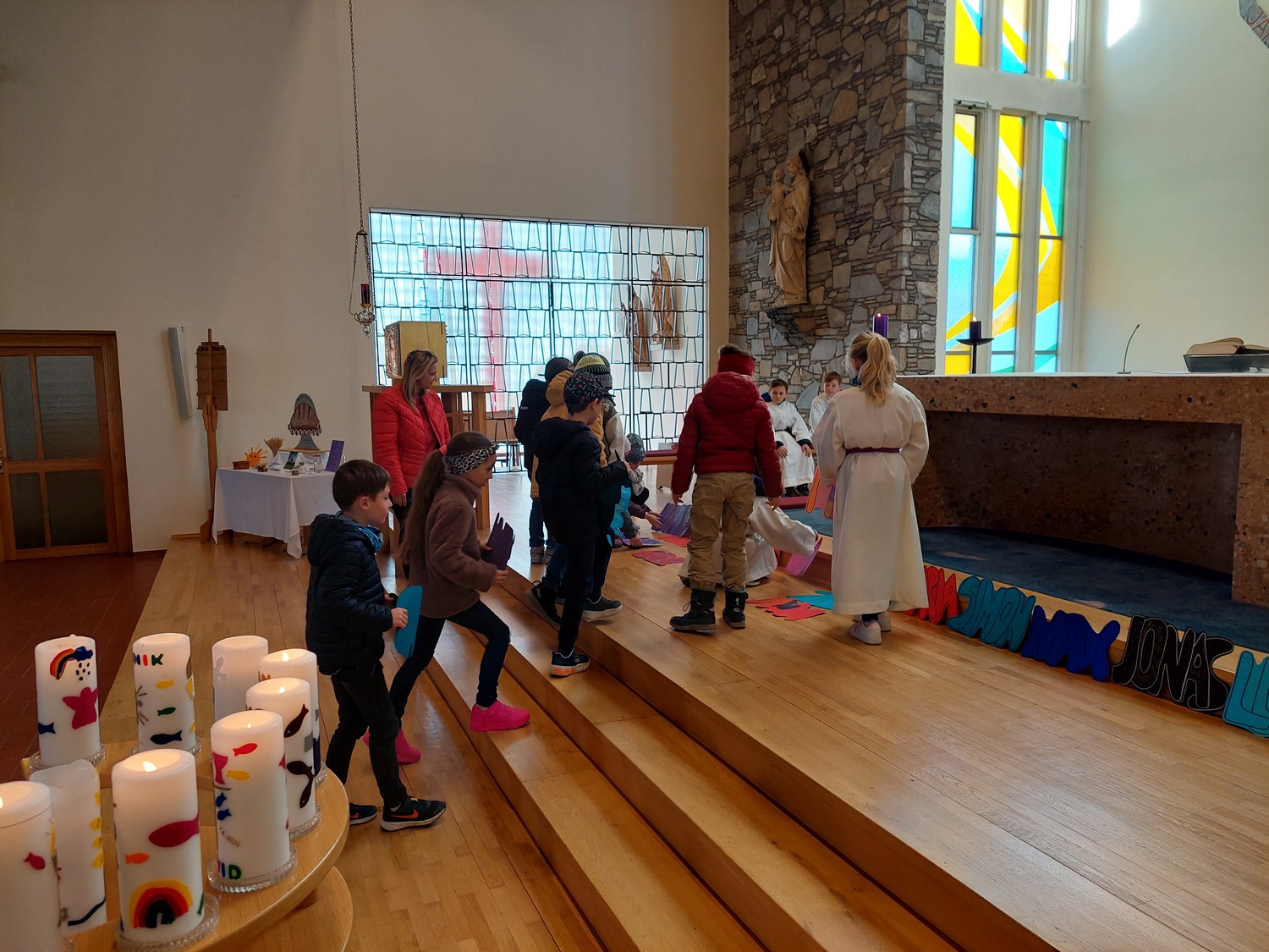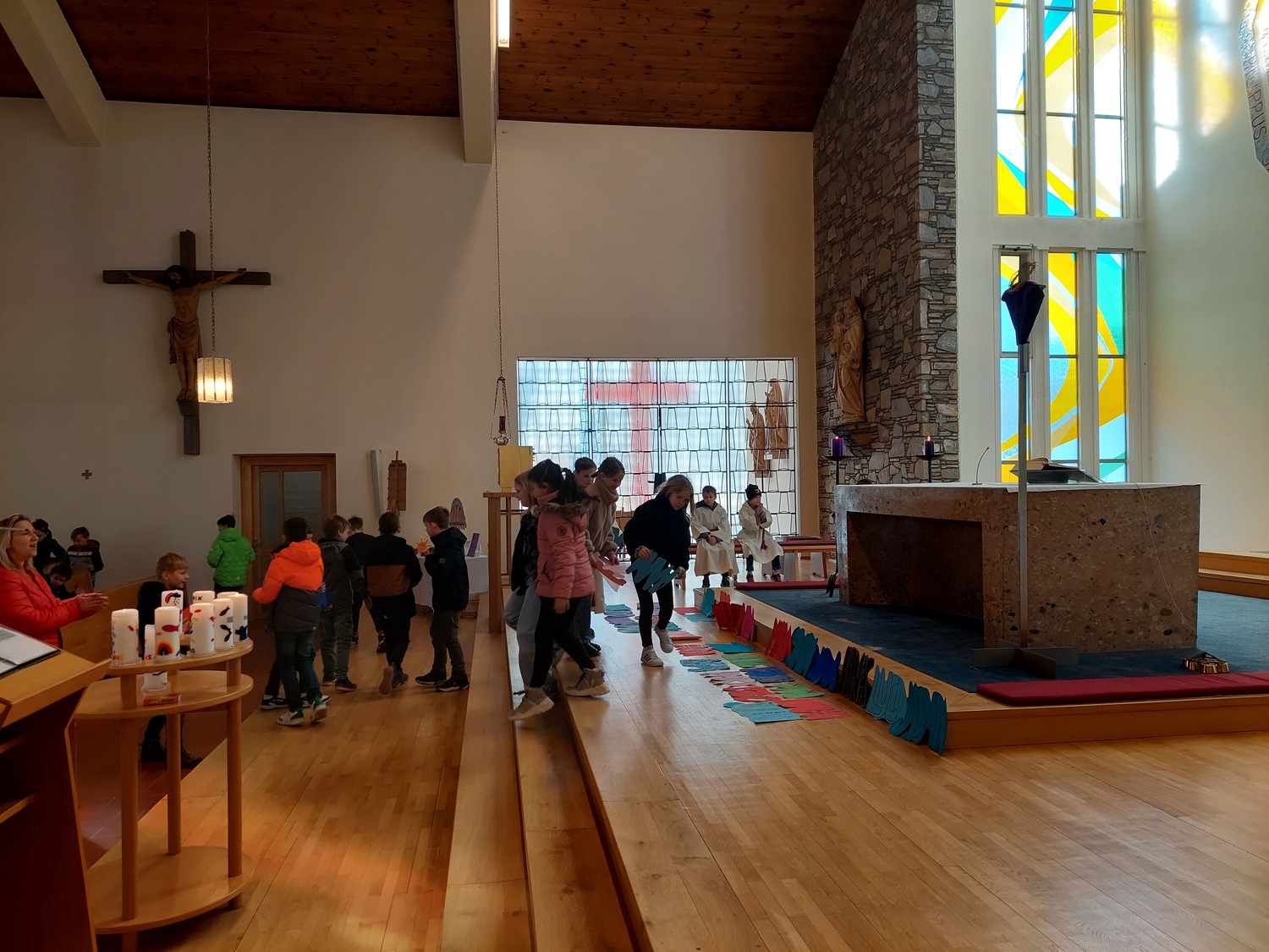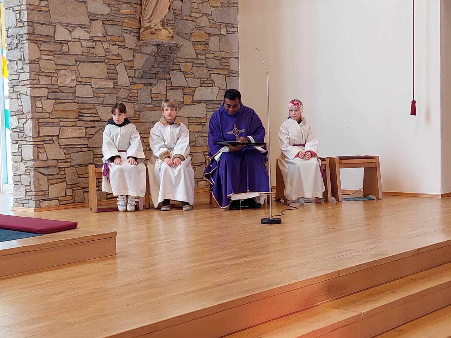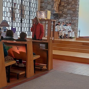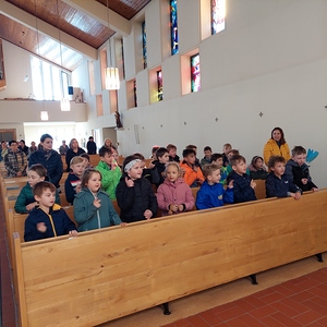 Die Schülerinnen und Schüler der Volksschule feierten gemeinsam mit P. Jomon, dem Lehrkörper und einigen Eltern sowie Großeltern einen feierlichen Ostergottesdienst.