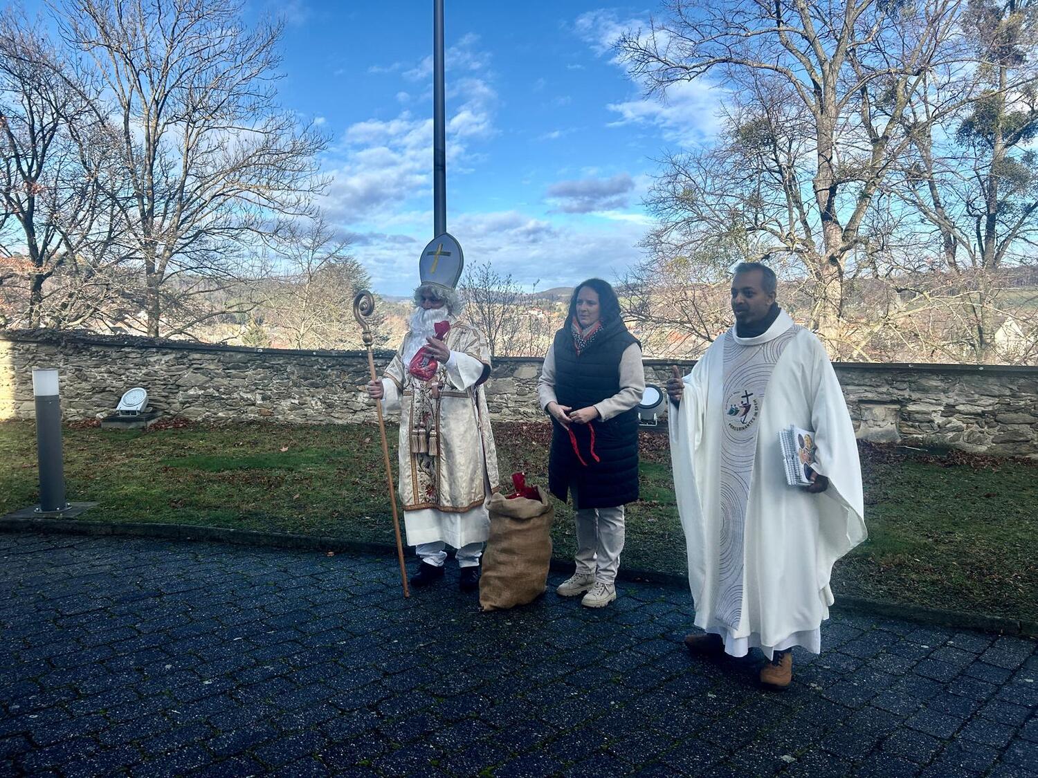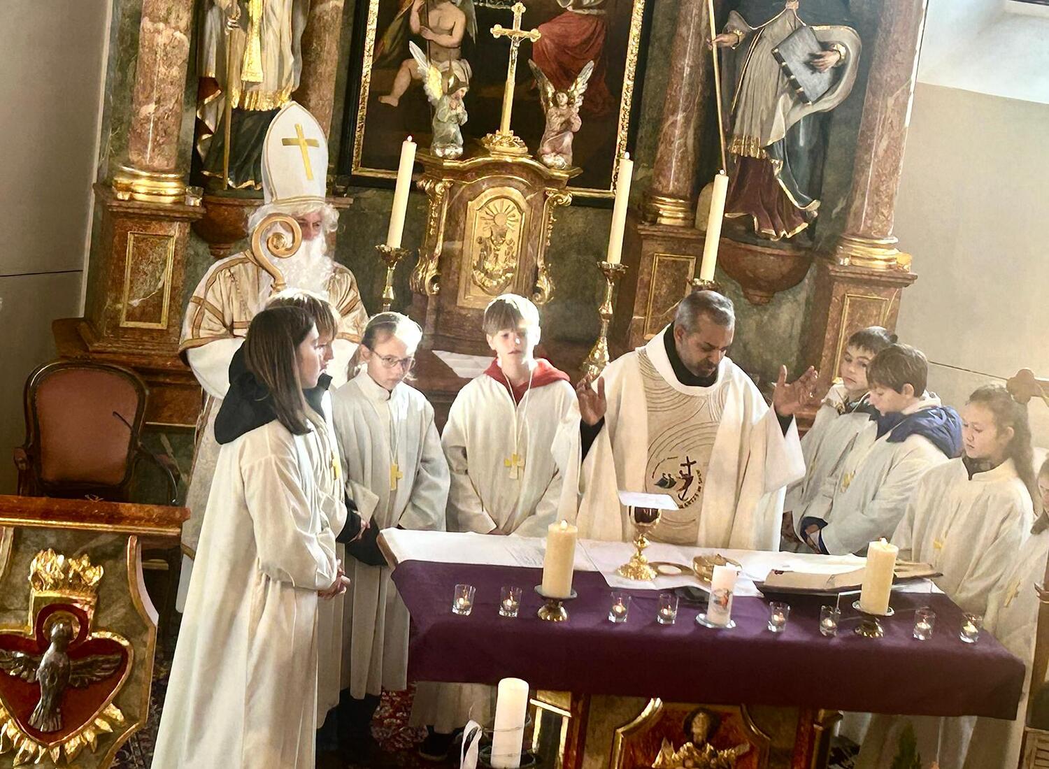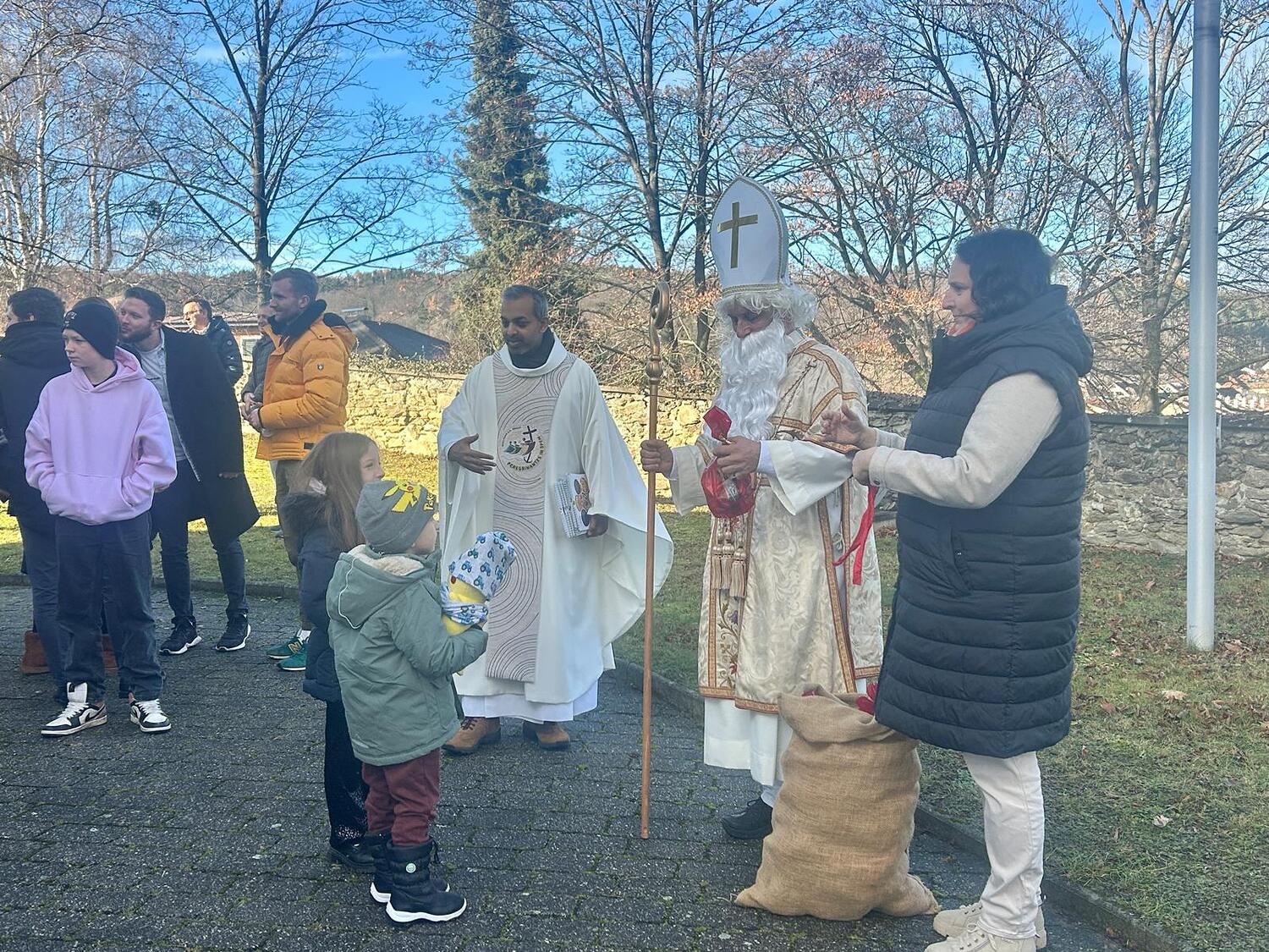 Feierlich wurde der Nikolaus von Pfarrer Shinto begrüßt. In einer kindgerechten Gesprächsrunde stellte der Pfarrer dem Nikolaus viele Fragen, die dieser den zahlreichen anwesenden Kindern verständlich und anschaulich beantwortete. Gemeinsam erklärten sie die Bedeutung der Mitra, des weißen Gewandes, des Bischofsstabes, des Ringes und des Kreuzes – Symbole, die an das Wirken und die Güte des hl. Nikolaus erinnern.