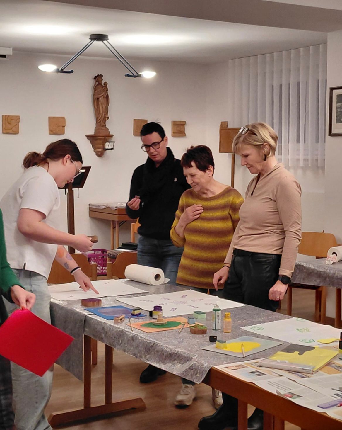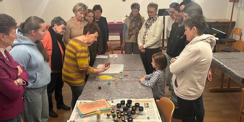 Am vergangenen Donnerstag, dem 26. März, verwandelte sich unser Pfarrheim in eine kreative Werkstatt. Unter der fachkundigen und inspirierenden Leitung von Frau Christa Fraunschiel - einer vielseitig engagierten Dame aus unserer Filiale Kalkgruben - tauchten zahlreiche Teilnehmerinnen in die faszinierende Welt des Stoff-Handdrucks ein.