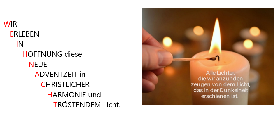 Sehen wir den Advent wieder als das, was es eigentlich heißt: Die Ankunft Gottes erwarten. Er kommt ganz leise, und so muss es auch sein, leise, damit wir überhaupt bemerken, dass er kommt, damit wir ihm wieder mehr Raum, Licht und Liebe in unserem Leben geben.