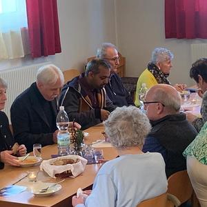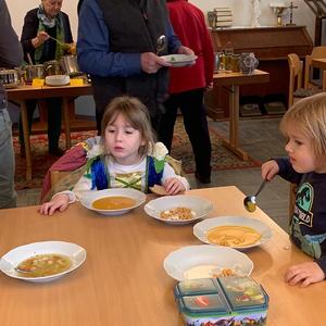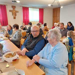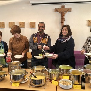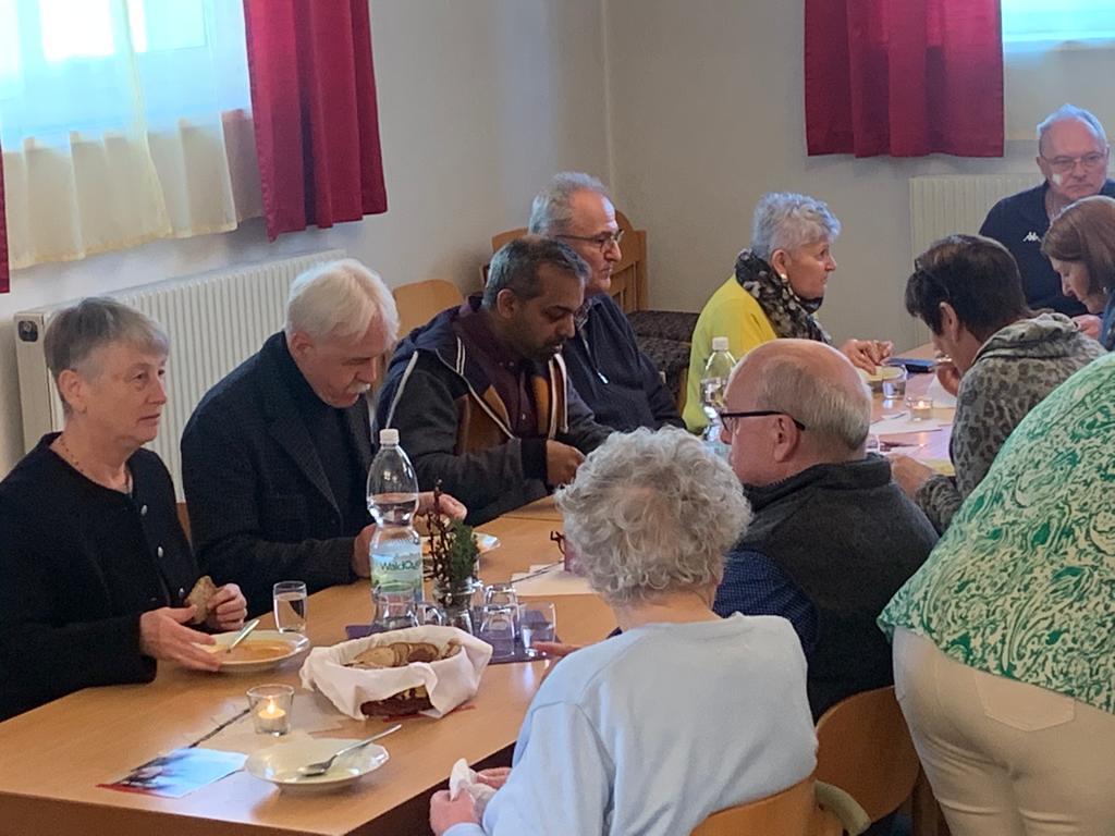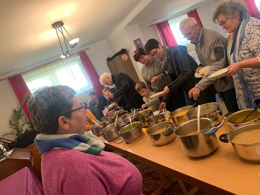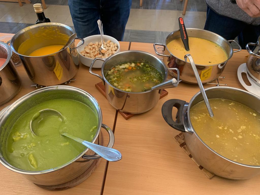 Anschließend gab es 16 verschiedene, köstliche Suppen zum Verkosten. Man konnte „Suppe im Glas“ mitnehmen, aber auch vor Ort konsumieren. Das Angebot wurde gut angenommen und viele waren froh, wieder in Gemeinschaft mit Anderen, Essen und Plaudern zu können.