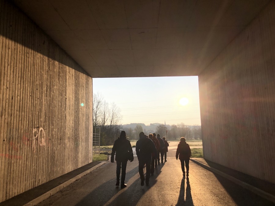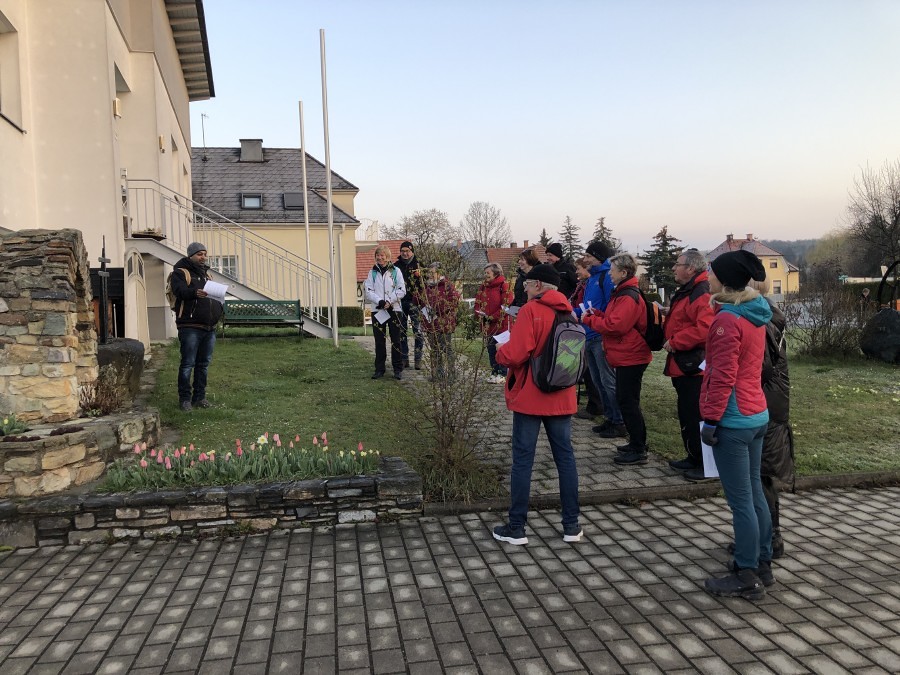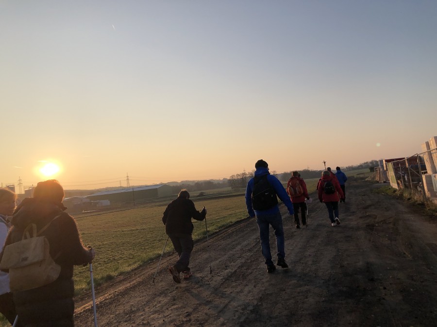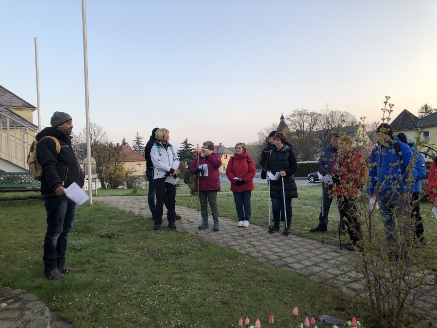 Vor dem Start am Morgen trafen sich alle zu einer kurzen Besinnung beim Pfarrhof Kobersdorf. Von dort marschierte die Gruppe nach Weppersdorf, wo in der Kirche die 2. Station gebetet wurde und sich noch einige Wanderer dazugesellten. Die 3. Station wurde bei Sonnenaufgang auf dem Weg nach Lackenbach gebetet. Meditative Texte erinnerten dabei an das Leben des Menschen als Weg zu Gott.