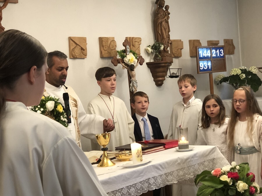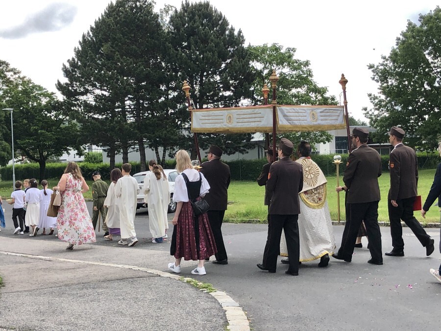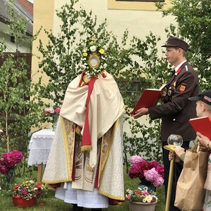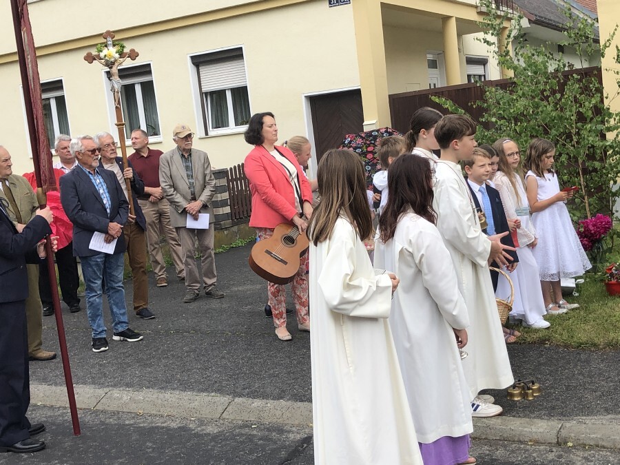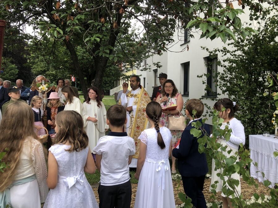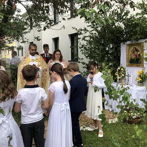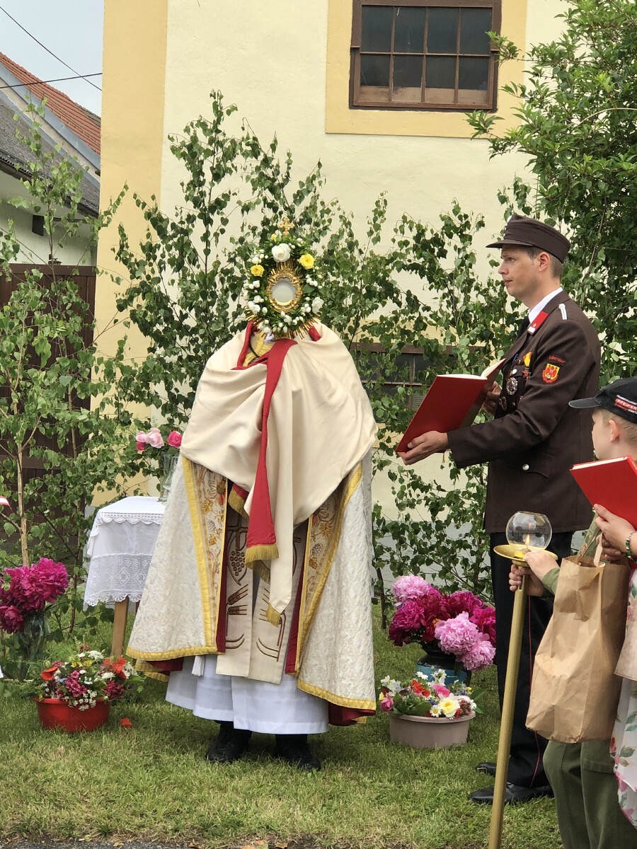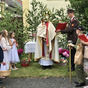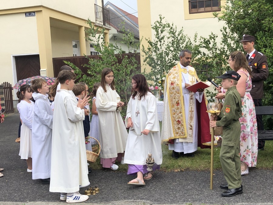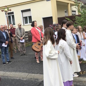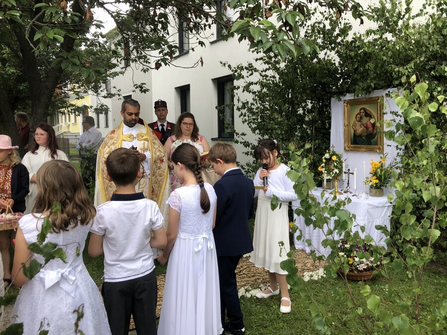 Wetterbedingt musste der Ablauf in Kobersdorf kurzfristig geändert werden. Begonnen wurde mit der Prozession zu 3 Altären, die sehr liebevoll gestaltet waren. Ein schönes Zeichen setzten unsere Erstkommunionkinder mit ihren Tischmüttern, die die erste Station mit Musik und Texten mitgestaltet haben. Die Hl. Messe fand im Anschluss im Pfarrsaal statt.