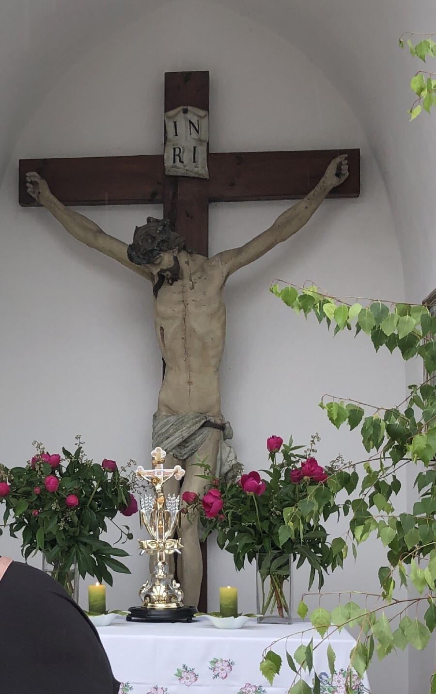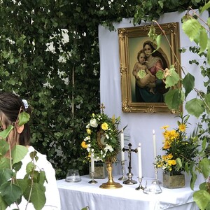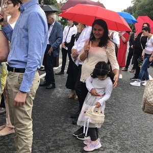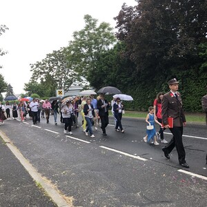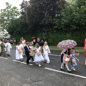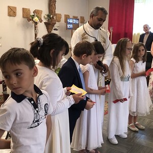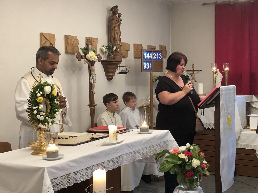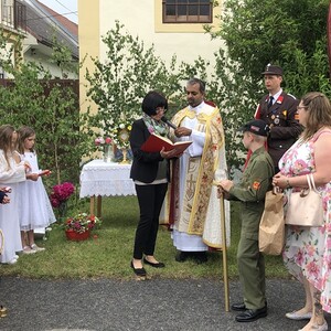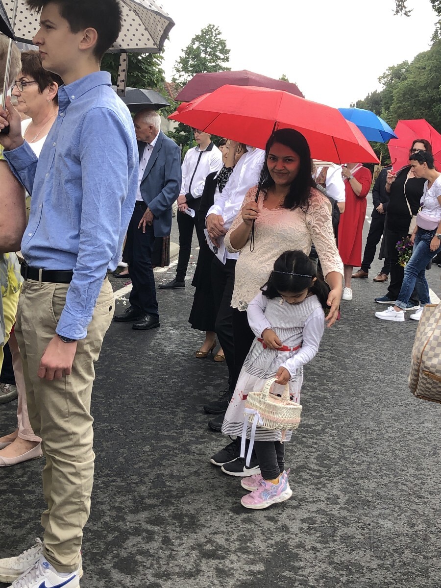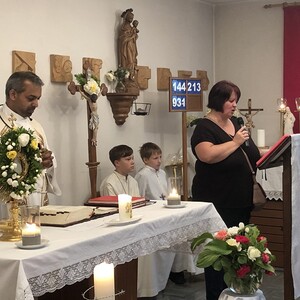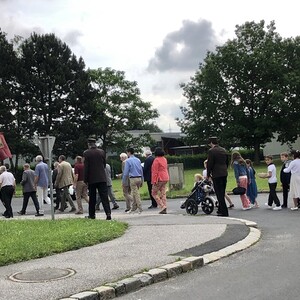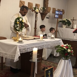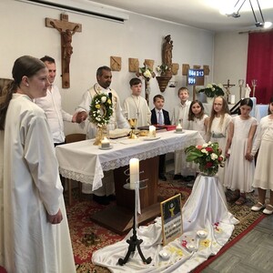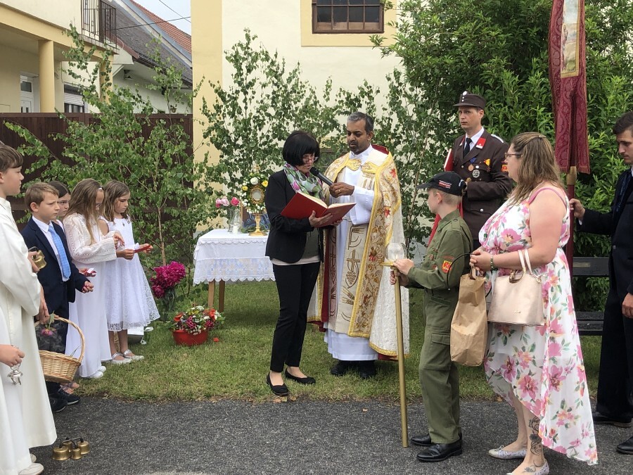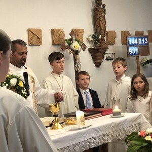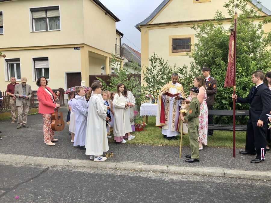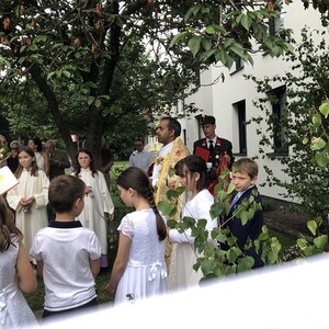 Wetterbedingt musste der Ablauf in Kobersdorf kurzfristig geändert werden. Begonnen wurde mit der Prozession zu 3 Altären, die sehr liebevoll gestaltet waren. Ein schönes Zeichen setzten unsere Erstkommunionkinder mit ihren Tischmüttern, die die erste Station mit Musik und Texten mitgestaltet haben. Die Hl. Messe fand im Anschluss im Pfarrsaal statt.