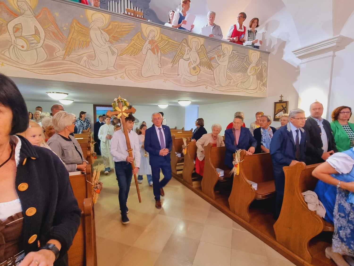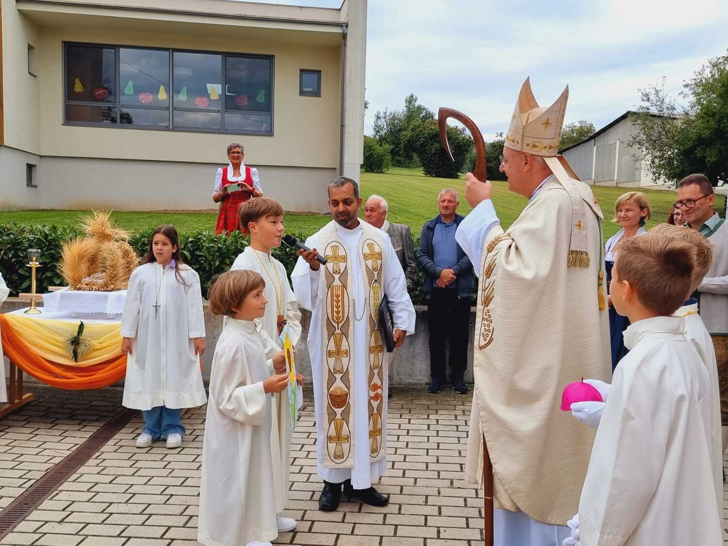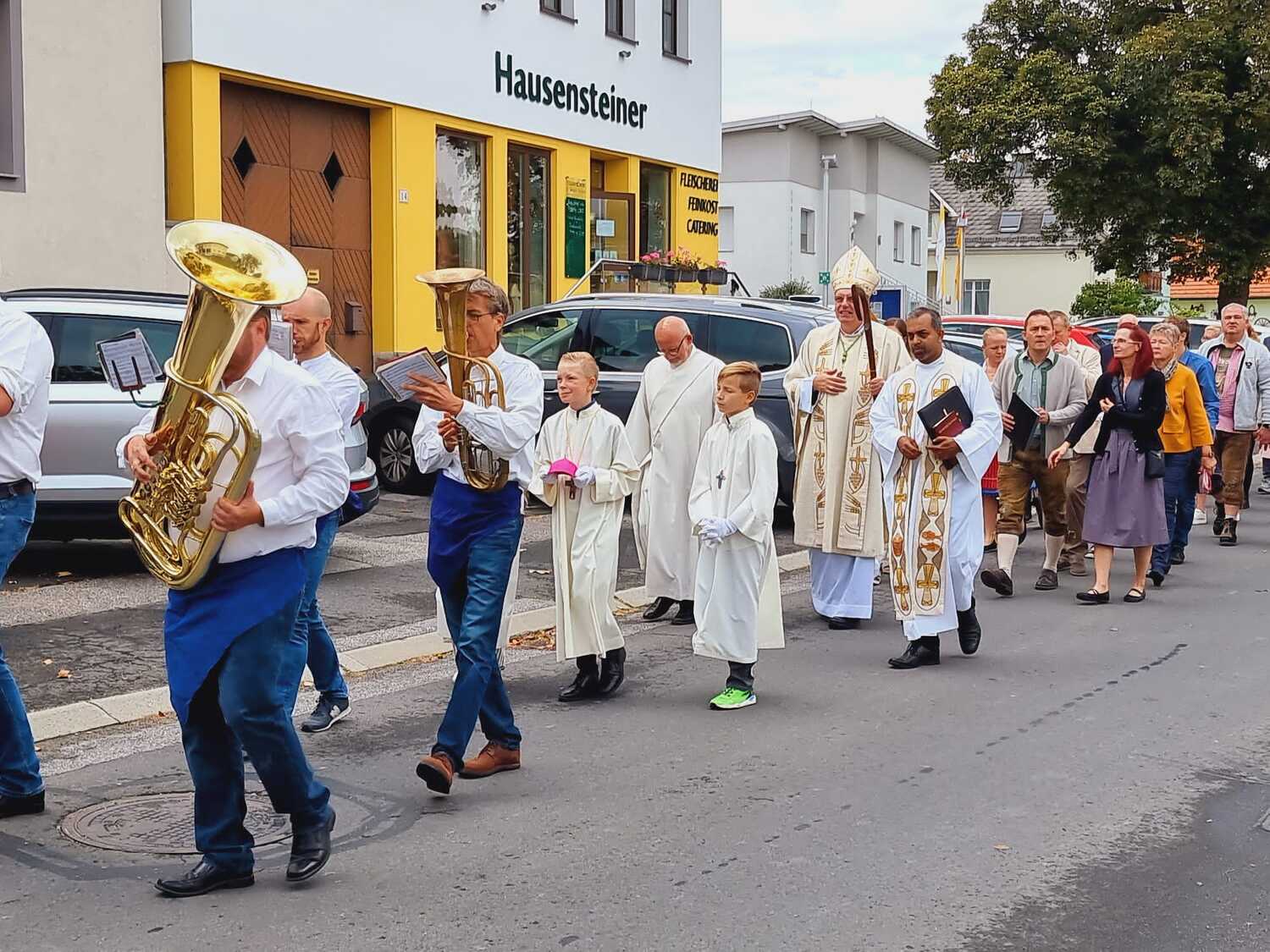 Das Kirchenvolk versammelte sich beim Pfarrhof, wo Herr Diözesanbischof Ä. Zsifkovics von den Kindern feierlich begrüßt wurde. Nach der Segnung der Erntekrone führte ein langer Festzug, angeführt vom Kreuz mit den Ministranten und der Blaskapelle Kirchschlag zum Gotteshaus, wo unser Herr Bischof dann die Segnung vornahm.