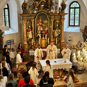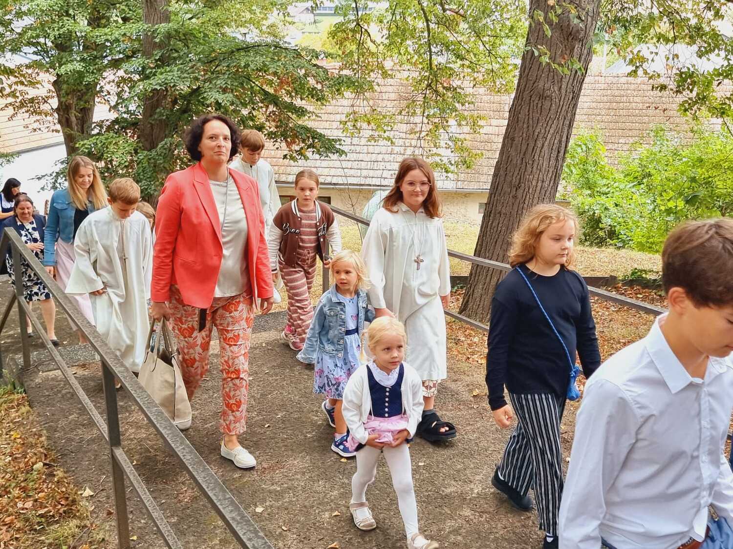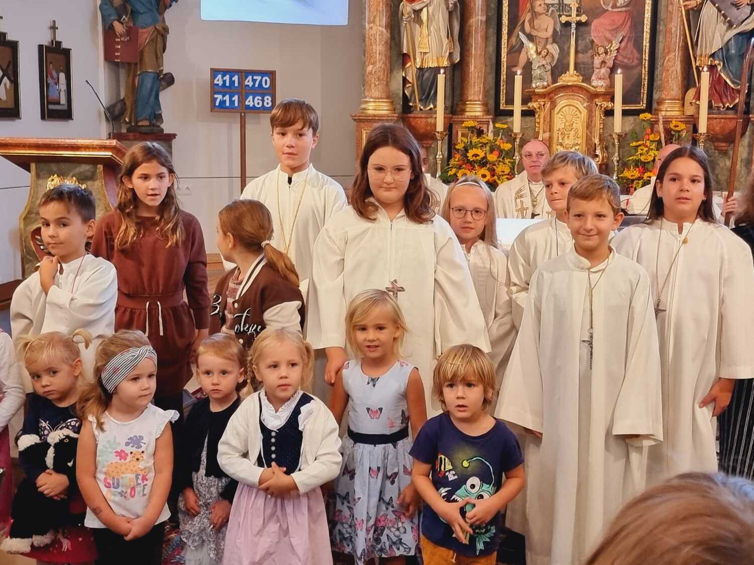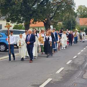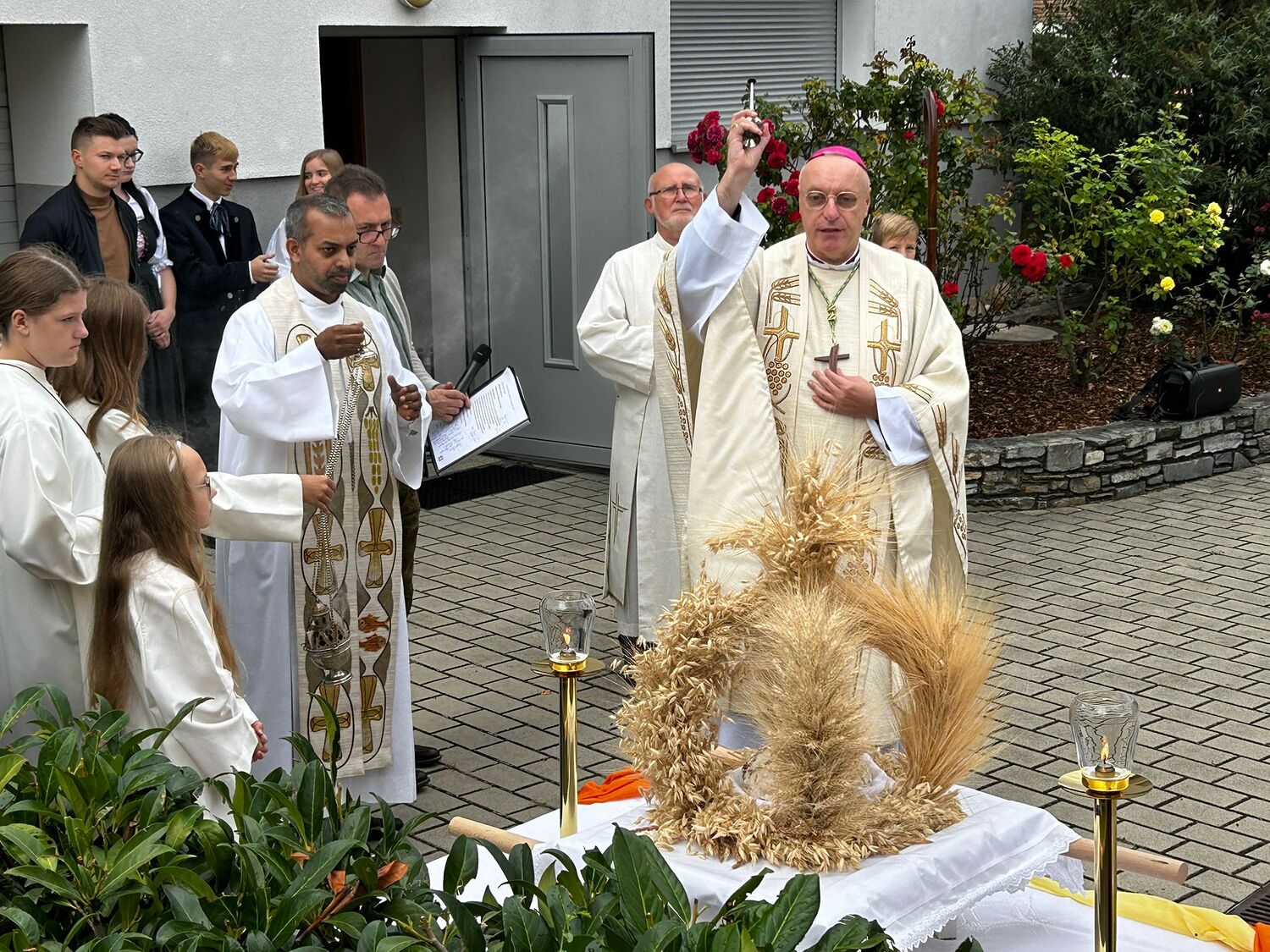 Das Kirchenvolk versammelte sich beim Pfarrhof, wo Herr Diözesanbischof Ä. Zsifkovics von den Kindern feierlich begrüßt wurde. Nach der Segnung der Erntekrone führte ein langer Festzug, angeführt vom Kreuz mit den Ministranten und der Blaskapelle Kirchschlag zum Gotteshaus, wo unser Herr Bischof dann die Segnung vornahm.