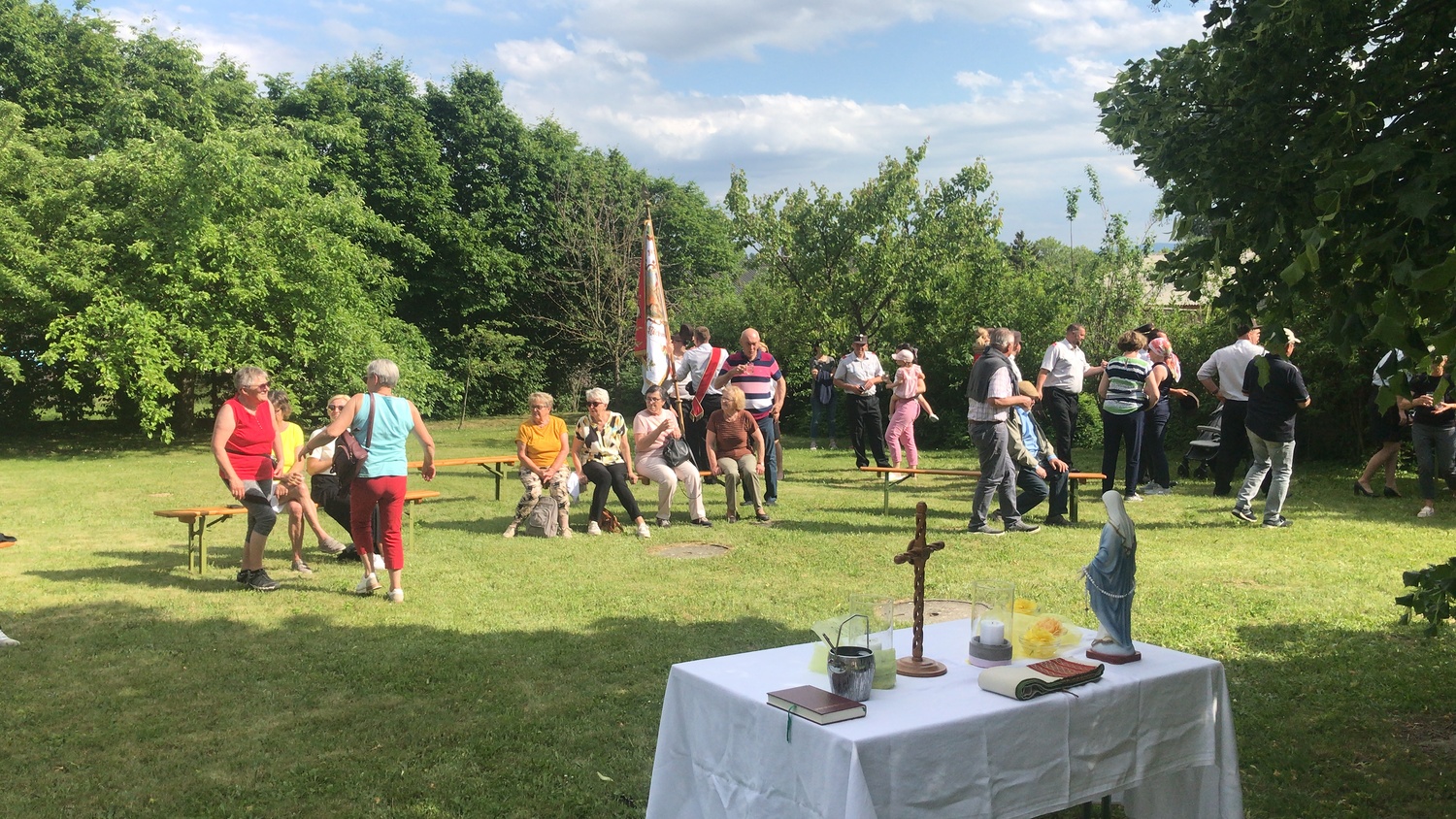 Am Sonntag, dem 22. Mai traf sich eine Schar gut gelaunter Wanderer bei der Josefsäule und startete nach einer kurzen Maiandacht durch die Natur Richtung Florianimarterl. Dort haben uns die Lackenbacher Florianijünger sehr zahlreich erwartet und mit uns die nächste kurze Andacht gestaltet. Gemeinsam, mit den Florianis voran, ging es dann weiter in den Pfarrhofgarten Lackenbach, wo dann um Fruchtbarkeit für Feld und Flur, aber auch um Bewahrung vor Unwettern gebetet wurde.