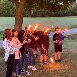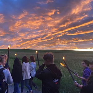 Passender hätte die Abendstimmung für die Fackelwanderung zum Thema „Feuer und Flamme“ nicht sein können. Man hatte das Gefühl, der Himmel brennt mit den Fackeln mit.