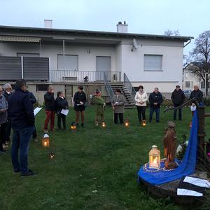 Rosenkranz betend marschierte die gemischte Gruppe in einer Lichterprozession zur 2. Station, die bei Pfarrer Mück im Garten stattfand. Bei dieser Station wurde unsere Lebendigkeit angesprochen, Sehnsüchte geweckt zur Kreativität, wie man gleichsam zur Mutter/zum Vater aller Lebendigen werden kann.