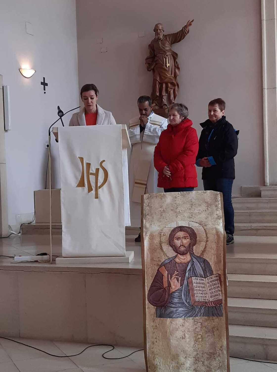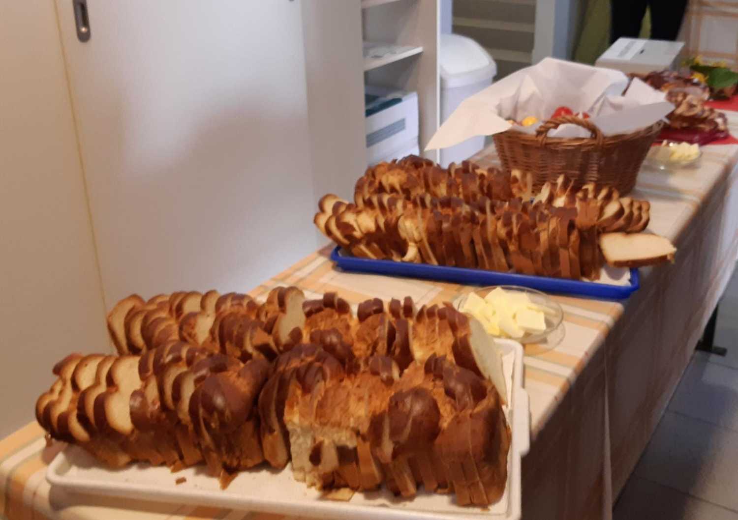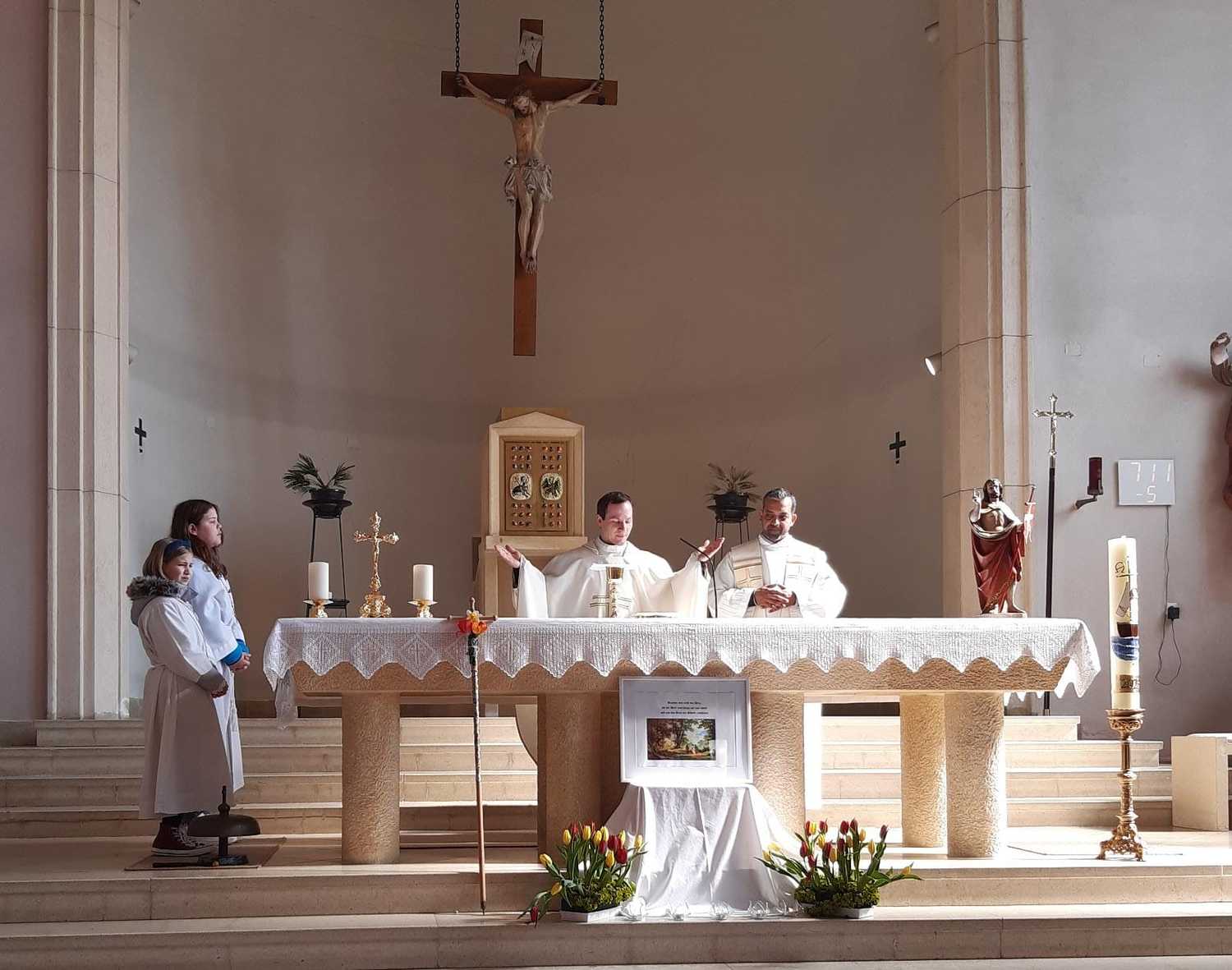 Nach 2 Stunden war dann Lackenbach erreicht, wo die vielen Wanderer aus allen Pfarren und Filialgemeinden mit einem guten Frühstück versorgt wurden. Anschließend feierte Gastpriester David Gold und Pfarrer Shinto die Eucharistie mit uns. Zu den 40 Emmauspilgern hatten sich noch weitere Gläubige gesellt, die den Weg nicht zu Fuß machen konnten, die Heilige Messe zum Osterfest aber nicht versäumen wollten.
