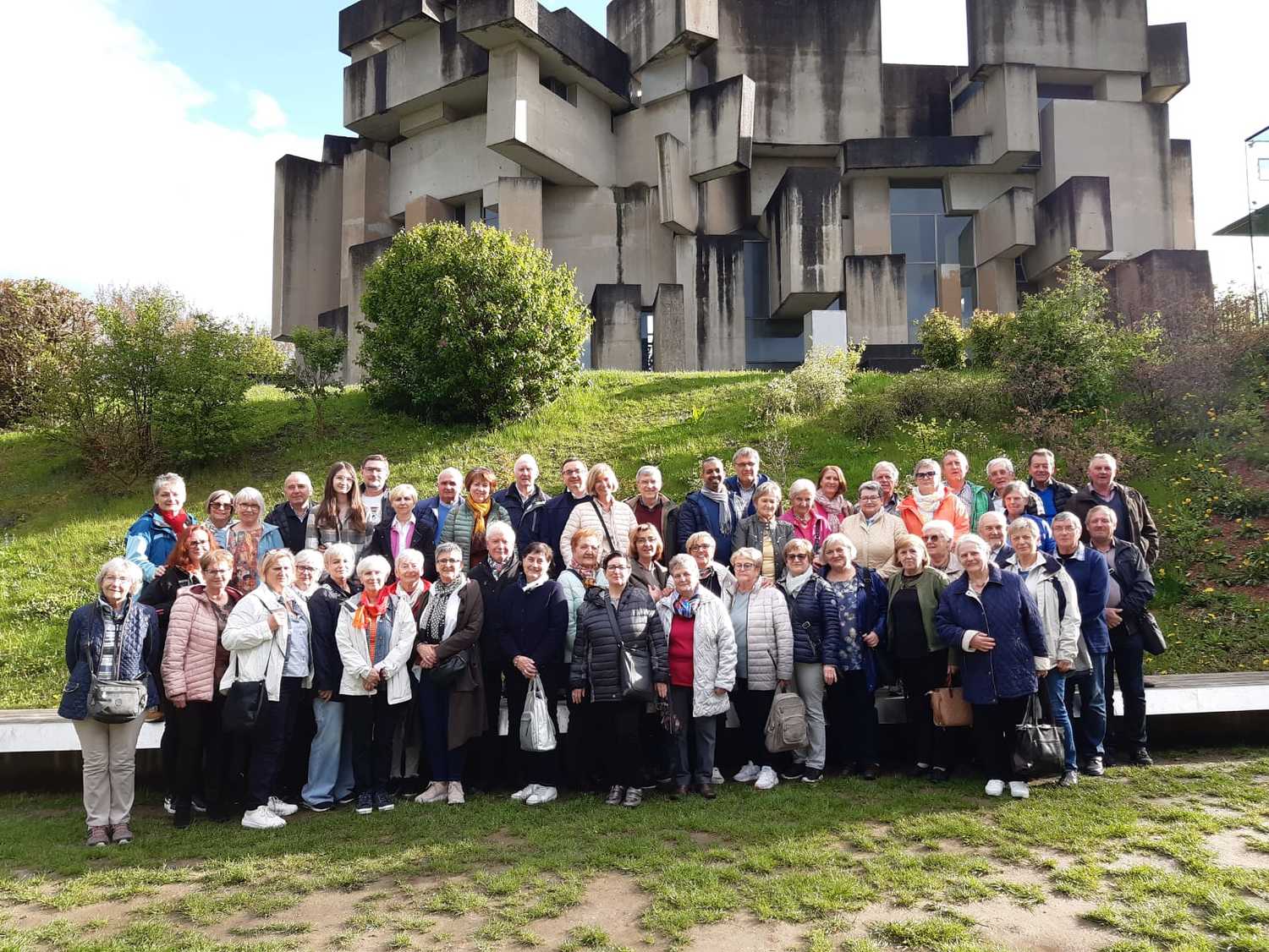 Beendet wurde der Ausflug mit einem Besuch der Wotrubakirche am Georgenberg in Wien-Mauer, welche in den 70-ger Jahren des 20. Jahrhunderts nach Entwürfen des Bildhauers Fritz Wotruba erbaut wurde. Das Kirchengebäude ist stilistisch dem Brutalismus zuzurechnen. Die Wotrubakirche, die heute zu den touristischen Sehenswürdigkeiten von Wien zählt, wirkte auf die knapp 60 Reiseteilnehmer sehr beeindruckend.