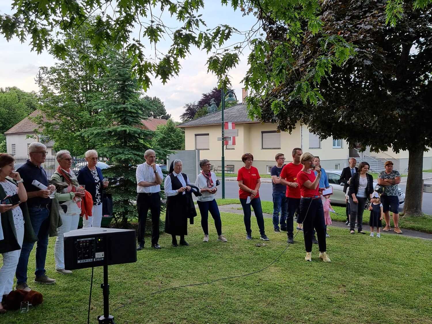 Mit einer Kerzen- und Laternenwanderung ging es nun zum Kirchenhof der katholischen Kirche. Diese war bereits in Regenbogenfarben sehr feierlich beleuchtet. Das Musikprogramm mit Bläsern und der Sängergruppe der Familie Tröscher war sehr vielfältig und unterhaltsam.