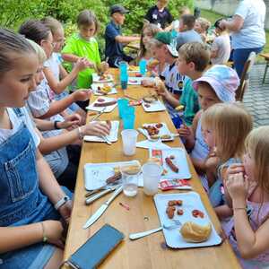 Um 17 Uhr trafen wir uns zu einer gemeinsamen Andacht im Pfarrsaal, wo wir zusammen unser Abendgebet sprachen. Anschließend wurde im Hof gegrillt und wir konnten beim gemeinsamen Abendessen den Tag ausklingen lassen.