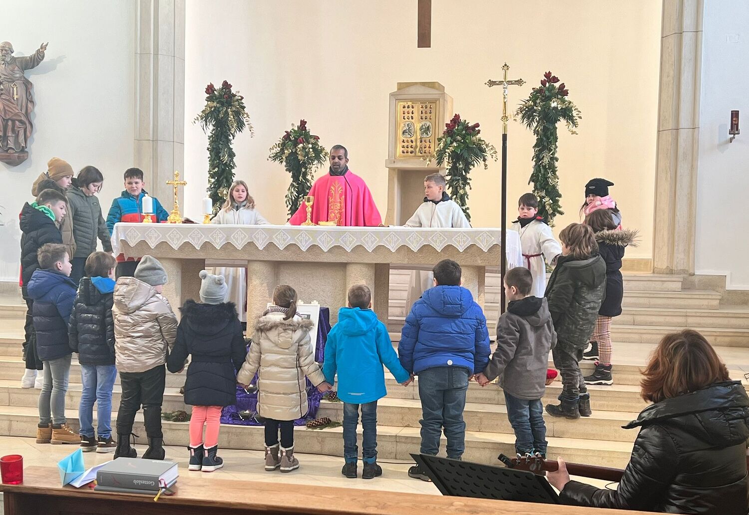 Die Kinder beeindruckten sowohl bei der persönlichen Vorstellung und den gestalteten Kyrie-Texten als auch mit ihrern bezaubernden gesanglichen Darbietungen, die Frau Religionslehrerin Adele Grill musikalisch liebevoll einstudiert und begleitet hat.