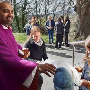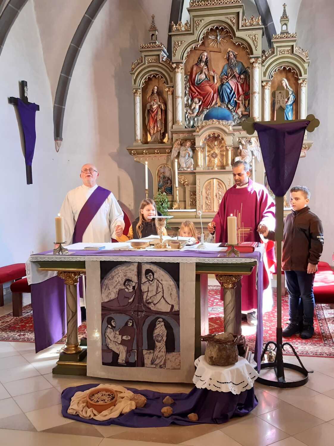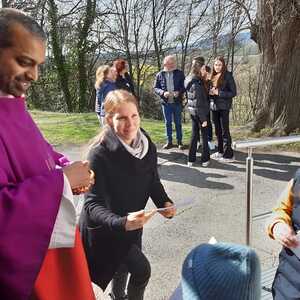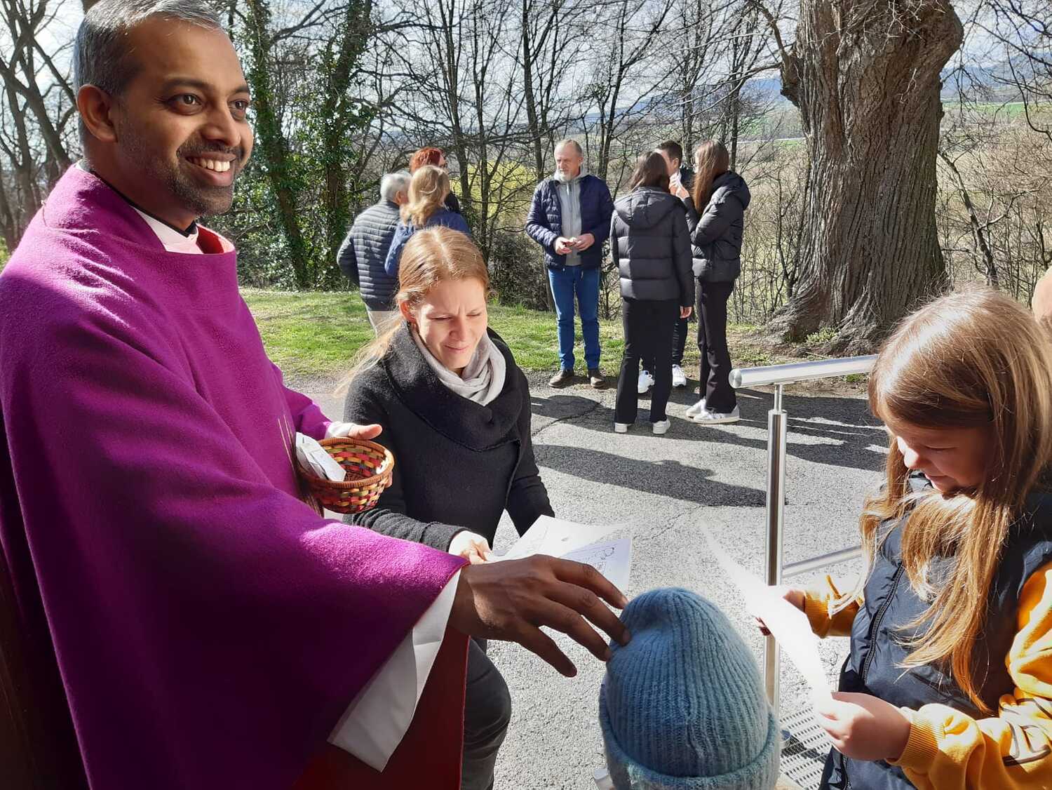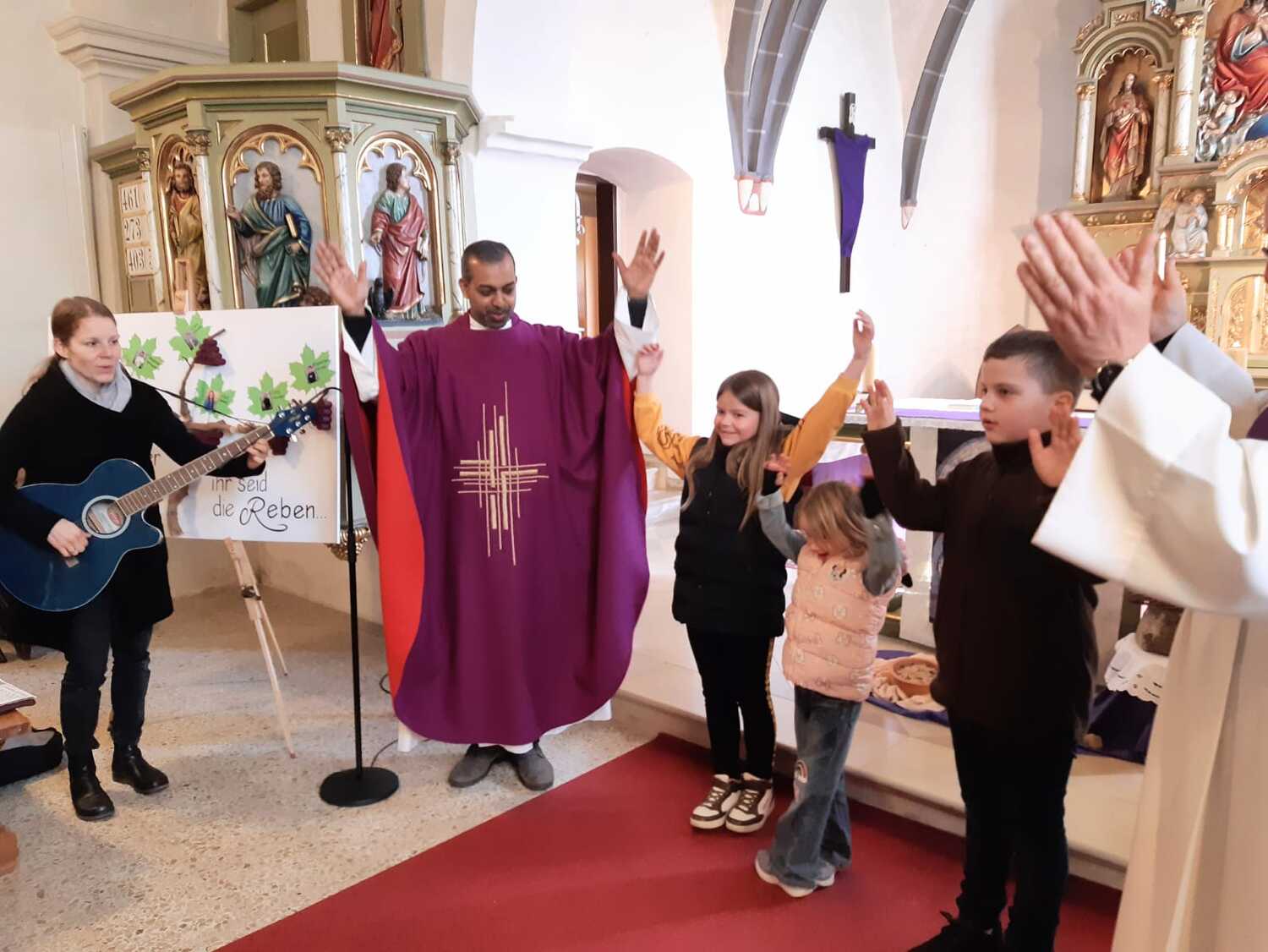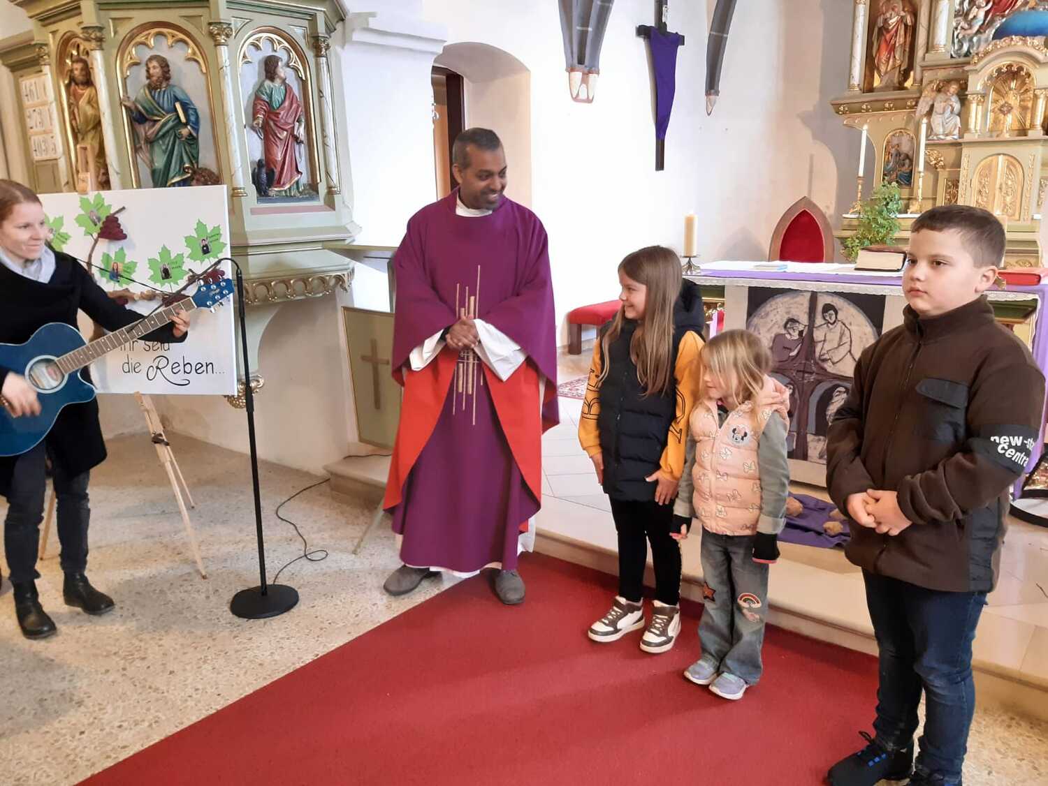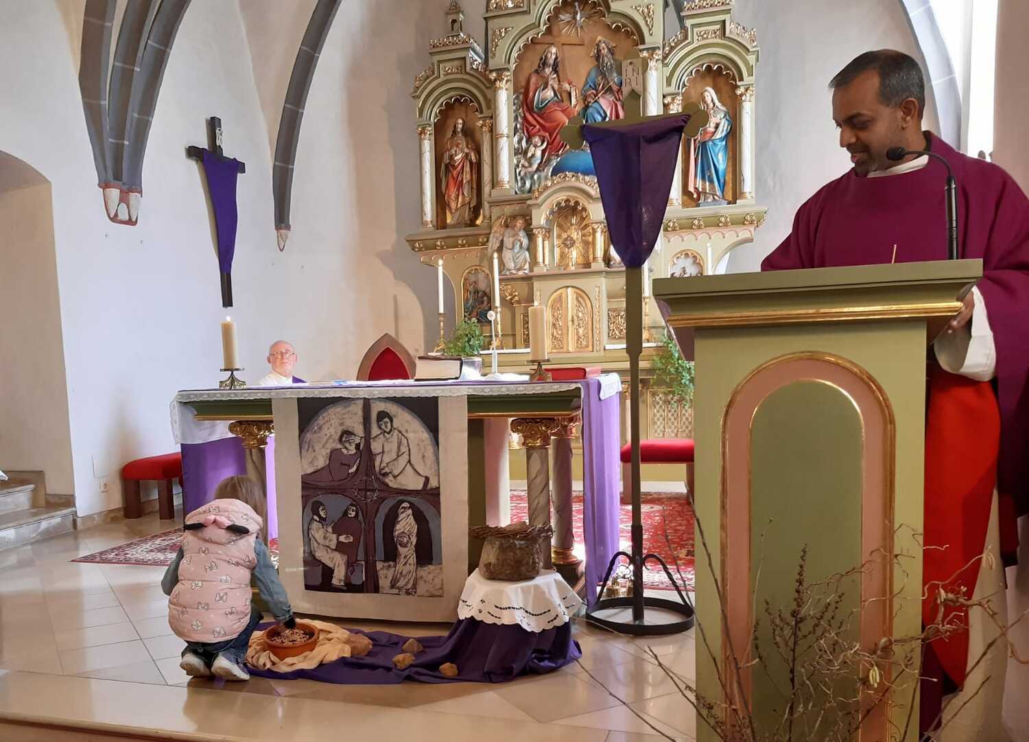 Zur Bibelstelle „Wenn das Weizenkorn in die Erde fällt und stirbt, bringt es reiche Frucht “ hatte Jungscharleiterin Katja am 5. Fastensonntag mit den Kindern einen wunderbaren Familien-Gottesdienst vorbereitet. Nach der Predigt, in der auch Pfarrer Shinto das Thema auslegte, brachten die Kinder Weizenkörner zum Altar und setzten diese dort in eine vorbereitete Schale mit gefüllter Erde – als Zeichen, dass auch unser Leben nicht fruchtlos bleibt. Anschließend sangen die Kinder das Lied „Gottes Liebe ist so wunderbar“. Am Ende des Gottesdienstes wurde an alle Gottesdienstbesucher ein kleines Säckchen mit Weizenkörnern verteilt.