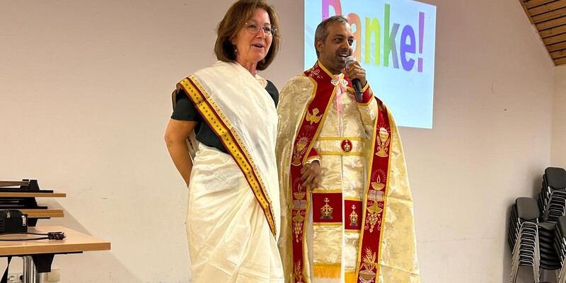 In traditioneller indischer Festtagskleidung präsentierte er uns ein farbenfrohes, harmonisches und friedvolles Miteinander der 20% Christen in Kerala mit ihren Mitbewohnern anderer Religionen.