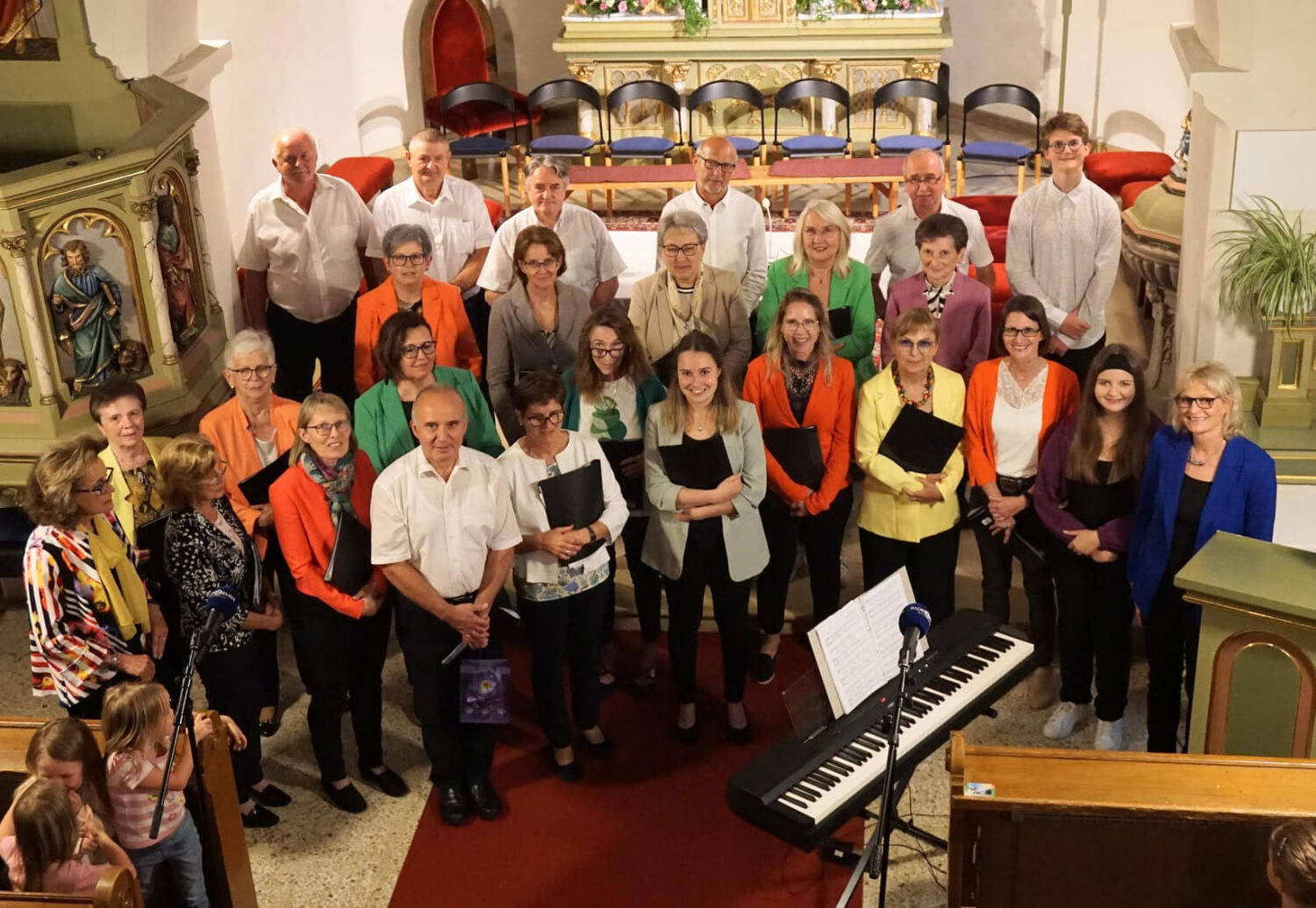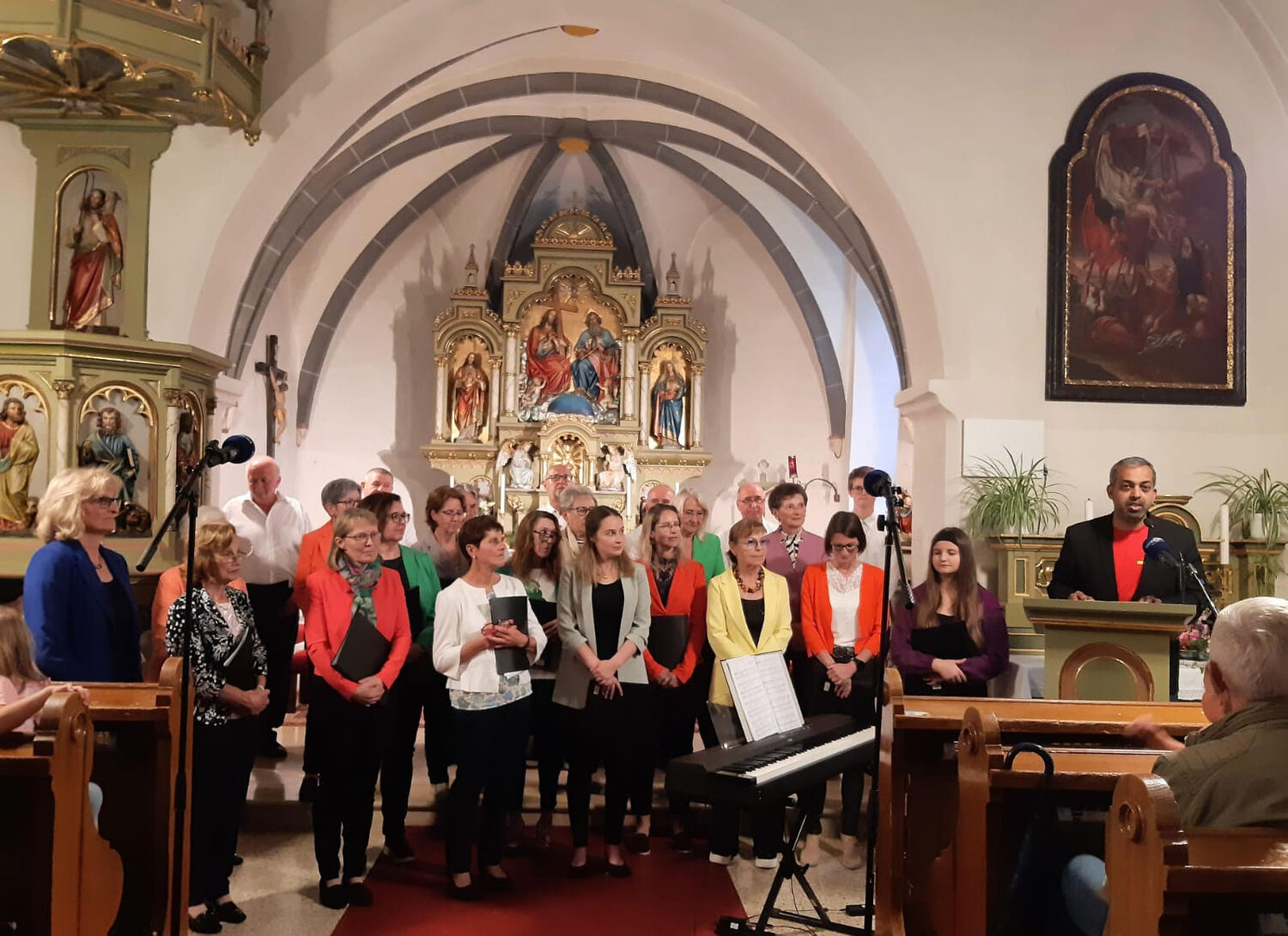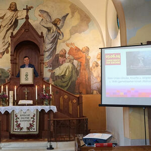 Der nächste Programmpunkt führte in die katholische Kirche. Unter der Leitung von Barbara Magyar Grabner sangen evangelische und katholische Frauen und Männer unter dem Motto „Bleibe bei uns Herr“ gemeinsam verschiedene Segenslieder für die zahlreichen Gäste. Zwischen den Liedern wurden stimmungsvolle Gedanken und Gebete vorgetragen. Außerdem erzählten Josef Bertha und Pfarrer Shinto aus der Geschichte der Dreifaltigkeitskirche.