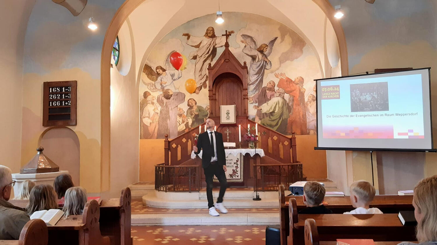 Danach zogen die Kinder in die alte Schule, wo ein abwechslungsreiches Kinderprogramm von Katja Schützenhofer und ihrem Team vorbereitet war. Während die Kinder dem Erzähltheater zum Thema „Ich mache euch zu Menschenfischern“ lauschten und danach bei einer Kreativstation Fische basteln konnten, führte David Piniel die Erwachsenen durch die Kirchen- und Glockengeschichte der Bekenntniskirche Weppersdorf. Zwischen den einzelnen Vortragsblöcken wurde gemeinsam gesungen und wer wollte, konnte die VaterUnser-Glocke besichtigen. Außerdem bestand die Möglichkeit einen Film zur Geschichte der Bekenntniskirche von Weppersdorf zu schauen.
