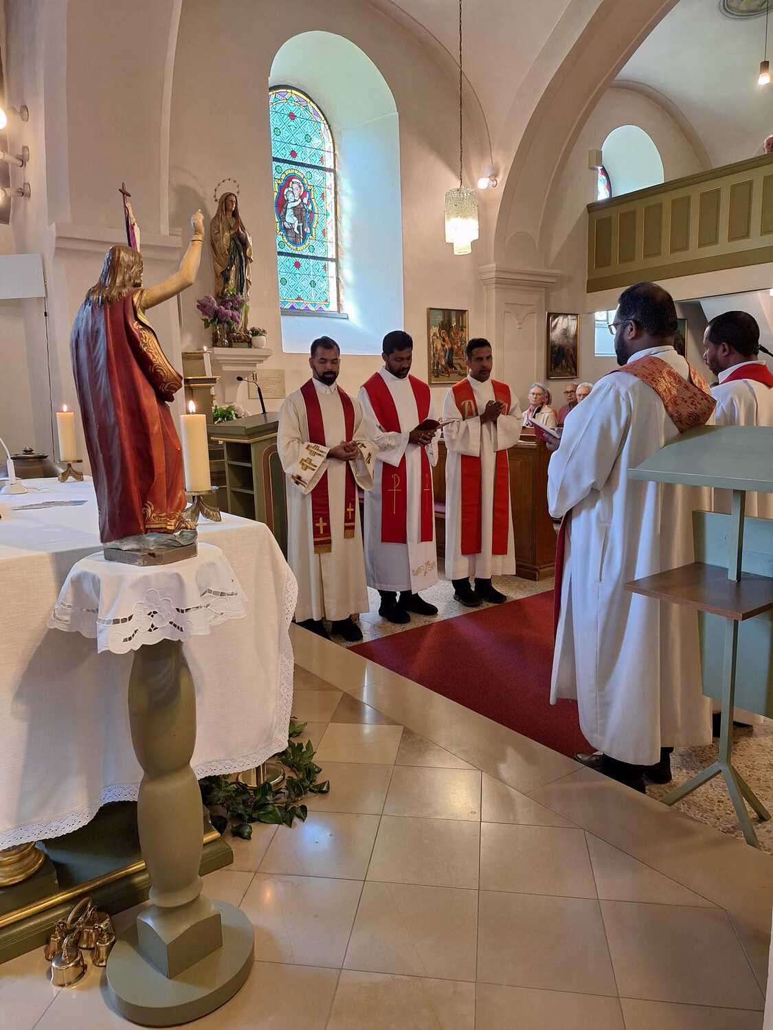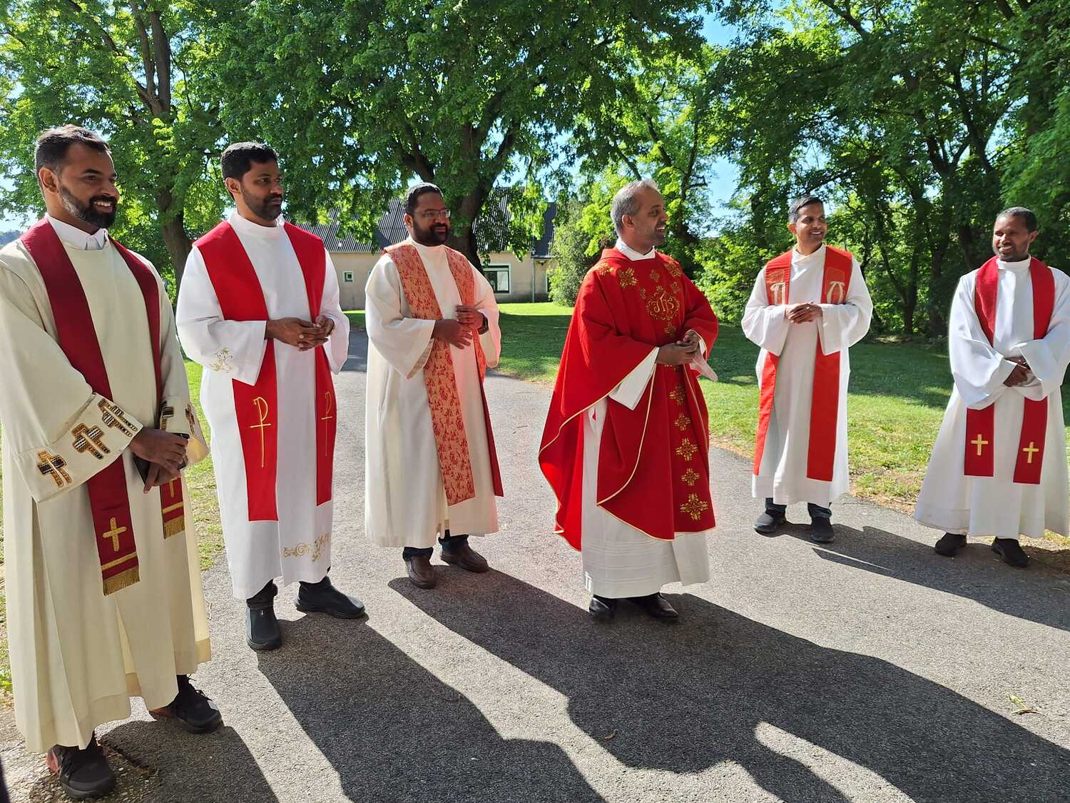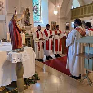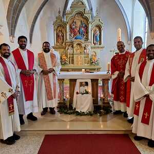 Unter der Trauergemeinde waren auch Gäste aus unserer Partnerdiözese Kanjirappally. Fünf Priesterfreunde von Pfarrer Shinto aus Kerala, die sich gerade auf Europabesuch befinden, waren Konzelebranten. Ihre Freundschaft und gemeinsamer Weg reicht in die Zeit im Knabenseminar zurück. Bevor der priesterliche Segen erbeten wurde, erhielt die Gemeinde einen Einblick in die Liturgie der Syro-malabarischen Kirche. Alle sechs Priester stimmten abwechseln ein Trauergebet an. Es beinhaltet Wechselgebete und verschiedene Psalmen, die für den Verstorbenen gesungen werden. Wir waren vom Klang und der Schönheit der Sprache Malayalam ergriffen und sehr beeindruckt.