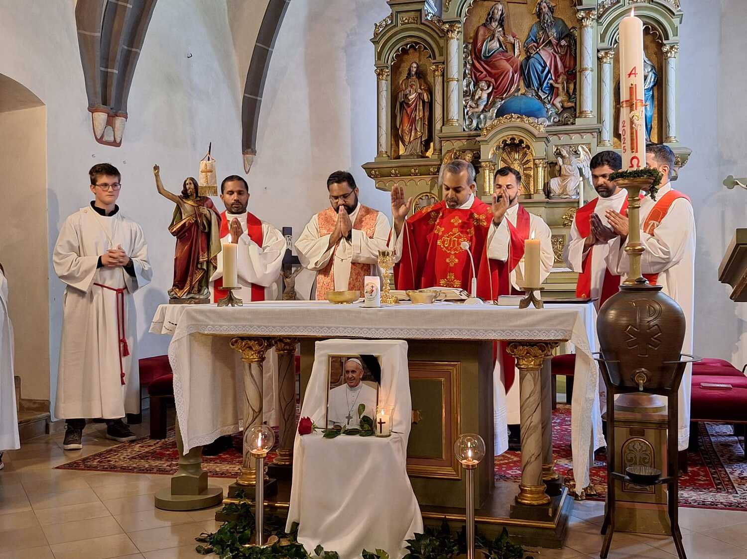 Der Tod des Bischofs von Rom hat uns alle am Ostermontag überrascht. Pfarrer Shinto erinnerte in seiner Predigt an die ersten Grußworte des Verstorbenen, an das liebevolle „Buona sera!“, mit der er die Menge grüßte. Sein unermüdlicher Einsatz für die Armen, die am Rande der Gesellschaft stehendenden und an die vielen Menschen, die er mit gütigen Augen wahrgenommen hat, wurde uns ins Gedächtnis gerufen. Wir erinnern uns an das Leben eines Hirten, der für seine Herde ein Vorbild an Bescheidenheit und Menschlichkeit war. „Bitte vergesst nicht, für mich zu beten!“ waren immer seine Schlussworte.
