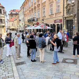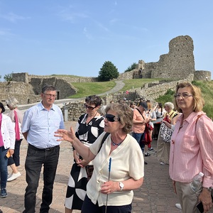 Nach dem Mittagessen erfolgte die Fortsetzung der Stadtführung, wobei auch eine längere Zeit für individuelle Besichtigungen bzw. Kaffeehausbesuche eingeplant waren. Zu Ende ging die Stadtführung mit einer Busrundfahrt, bei welcher die Burg von Bratislava und das Palais mit dem Sitz des slowakischen Präsidenten gezeigt wurden. Im Rahmen der Heimfahrt bestand noch die Möglichkeit, die Burg-Ruinen-Anlage von Devin zu besichtigen. Die Burg Devin liegt auf einer Anhöhe direkt bei der Mündung des Flusses March in die Donau und bietet einen herrlichen Ausblick nach Bratislava, ins Marchfeld und in das Gebiet rund um Hainburg bis ins Burgenland.