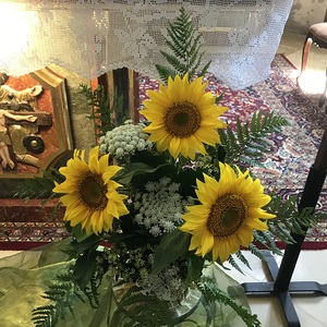 Sonnenblumen brauchen die Sonne zum Leben, sie brauchen Wärme und sie brauchen Licht, sie strecken sich der Sonne entgegen. Wenn die Sonne am Himmel wandert, dann wandern auch ihre Blüten mit. Wenn es dunkel wird, schließen sie sich und lassen ihre Köpfe hängen. Und sie haben eines gemeinsam: sie schauen immer in die gleiche Richtung und sind tief verzwurzelt.