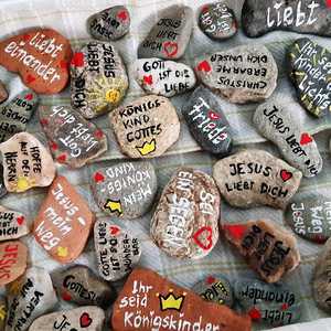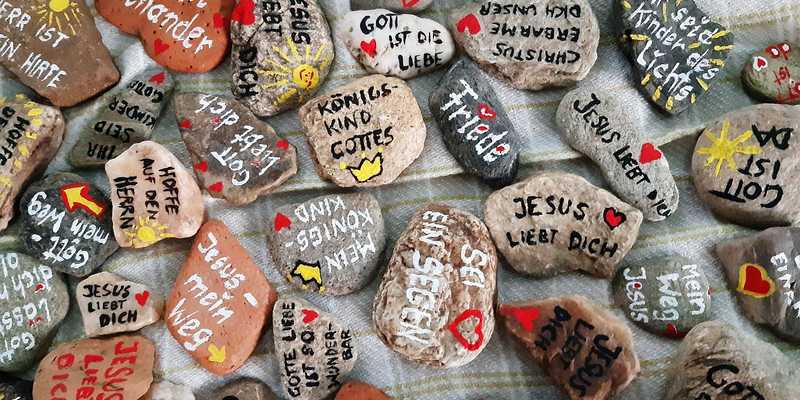 Jungscharleiterin Katja bereitete bunt bemalte Steine mit einer Botschaft vor, die die Kirchenbesucher mitnehmen durften, und diese in den kommenden Tagen und Wochen bei ihrem Urlaub, Reise, Ausflug an einen öffentlichen Ort legen sollen – dorthin, wo man denkt, dass sich jemand freut, von Gott und Jesus zu hören. Wir alle haben ja den Auftrag von Jesus erhalten, überall von Gott zu erzählen. Dieser Stein soll ein Symbol und Sprachrohr für uns sein.