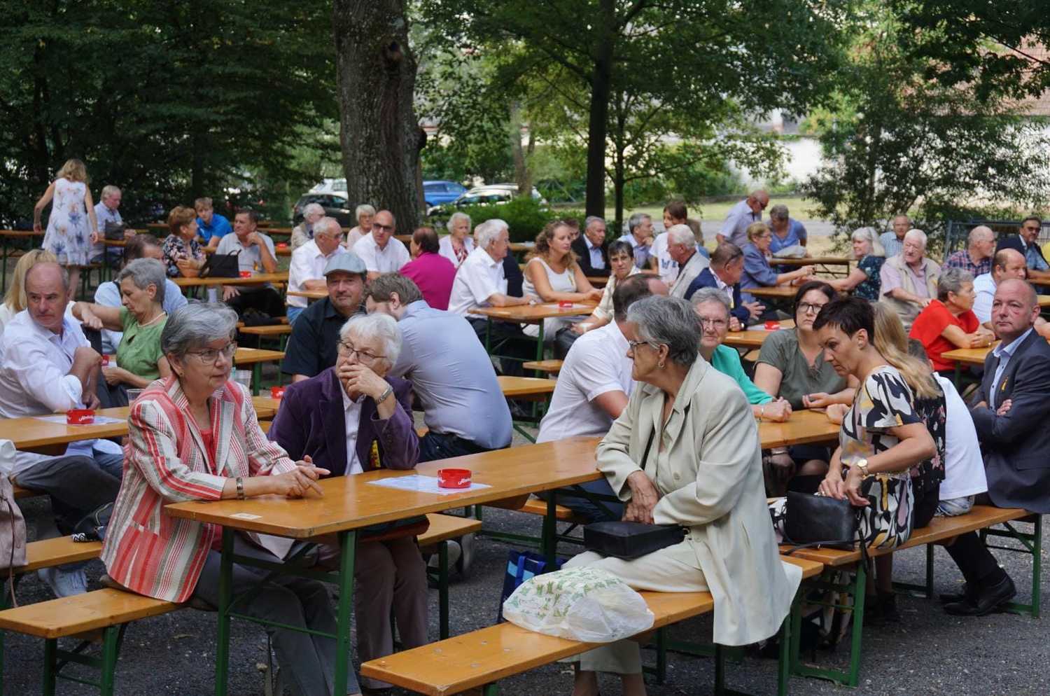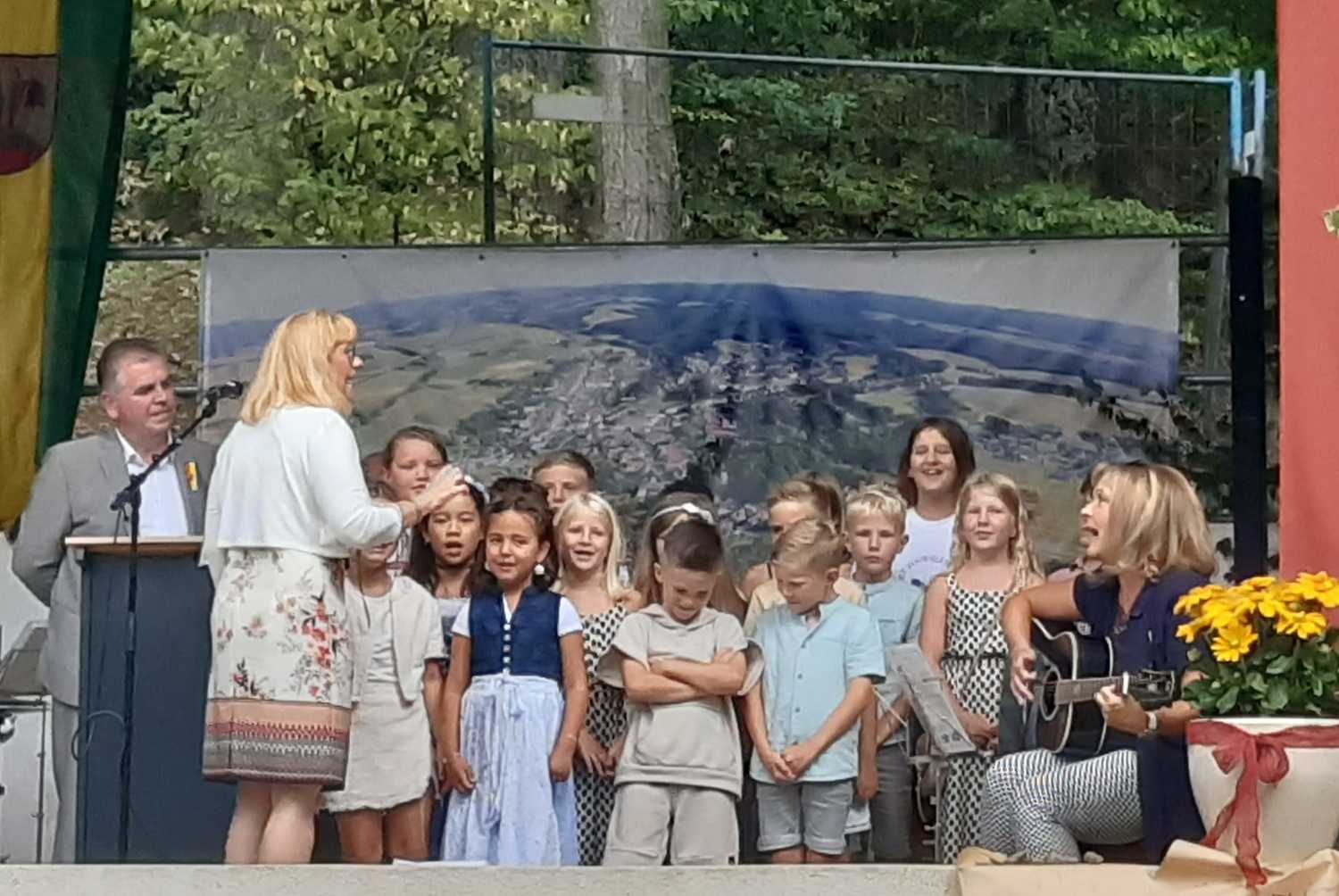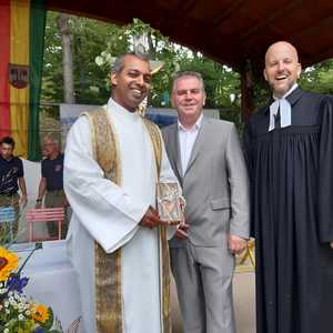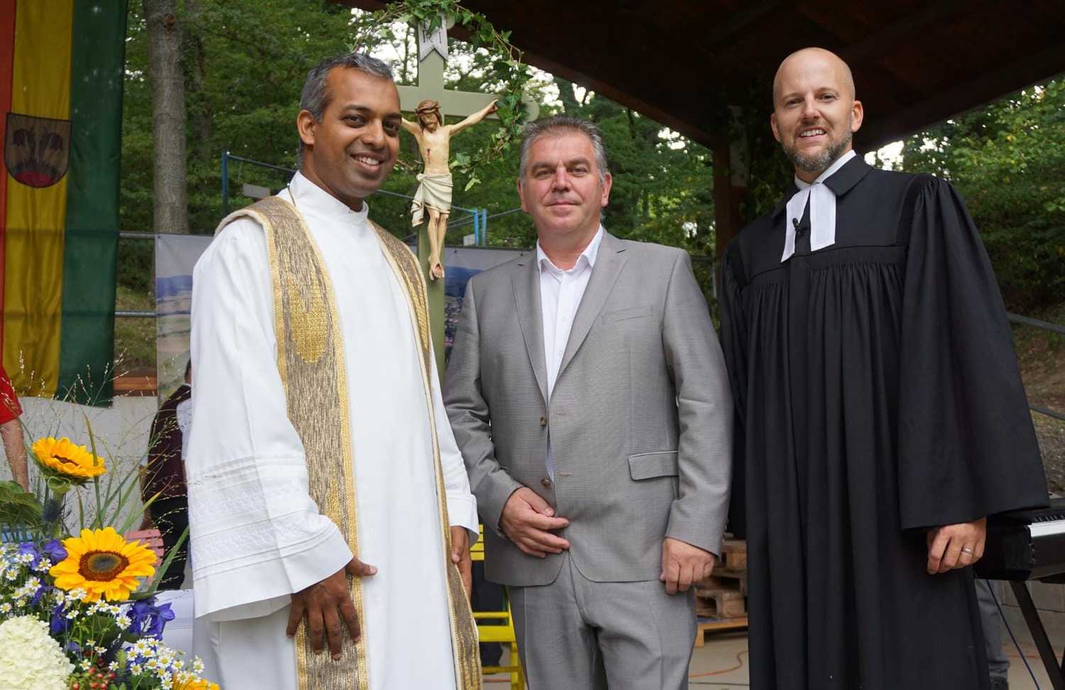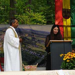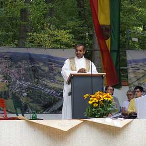 Die 800-Jahr-Feier, die am 14. August begangen wurde, war ein gelungenes Fest, zeigte sich doch das Wetter von seiner besten Seite. Begonnen wurde der Tag mit einem ökumenischen Festgottesdienst mit Hr. Pfarrer Stefan Grauwald und unserem Hr. Pfarrer Shinto Michael. Mitgestaltet wurde die Feier von den Kindern, die außerhalb der Kirche einen Kinderwortgottesdienst feierten und dann mit ihren selbstgestalteten Herzplakaten dazu kamen. Als kleine Erinnerung verteilten die Kinder am Ende des Festes selbstgebastelte Herzen mit dem Bibelspruch zum heutigen Evangelium Joh. 15,12: "Liebt einander, so wie ich euch geliebt habe."