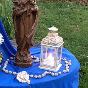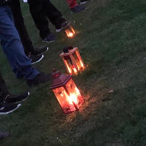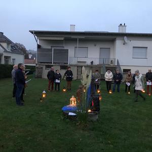 Rosenkranz betend marschierte die gemischte Gruppe in einer Lichterprozession zur 2. Station, die bei Pfarrer Mück im Garten stattfand. Bei dieser Station wurde unsere Lebendigkeit angesprochen, Sehnsüchte geweckt zur Kreativität, wie man gleichsam zur Mutter/zum Vater aller Lebendigen werden kann.