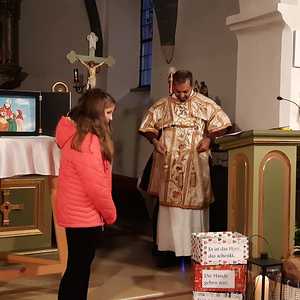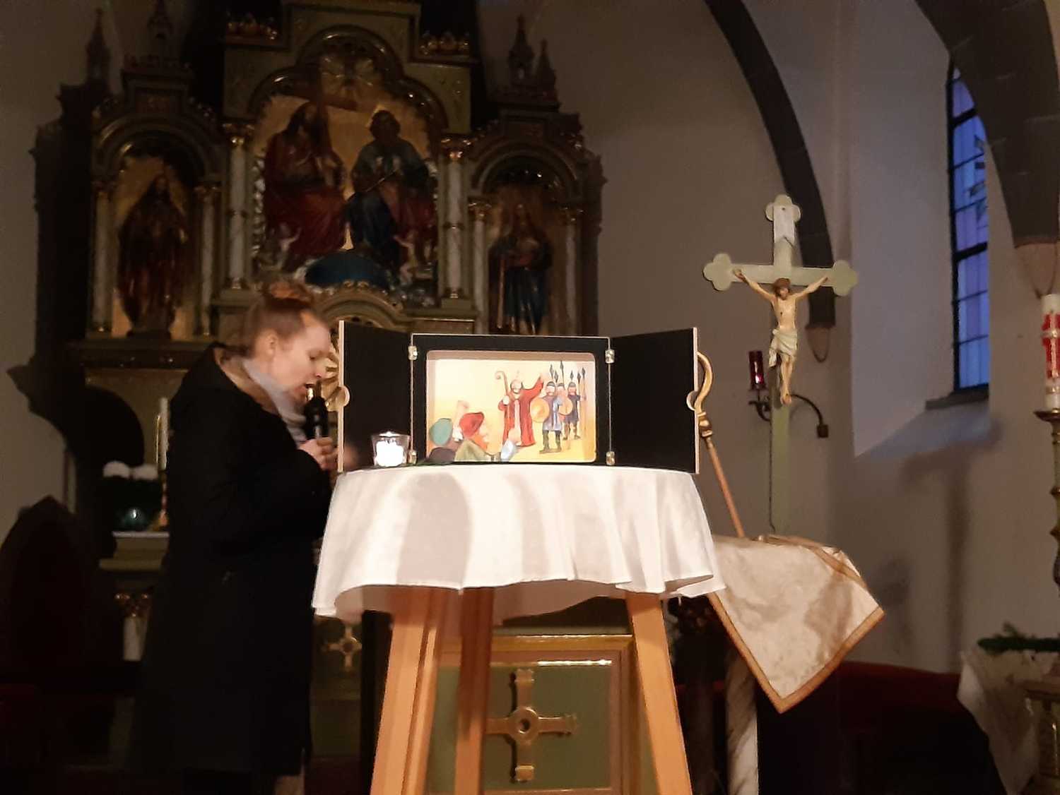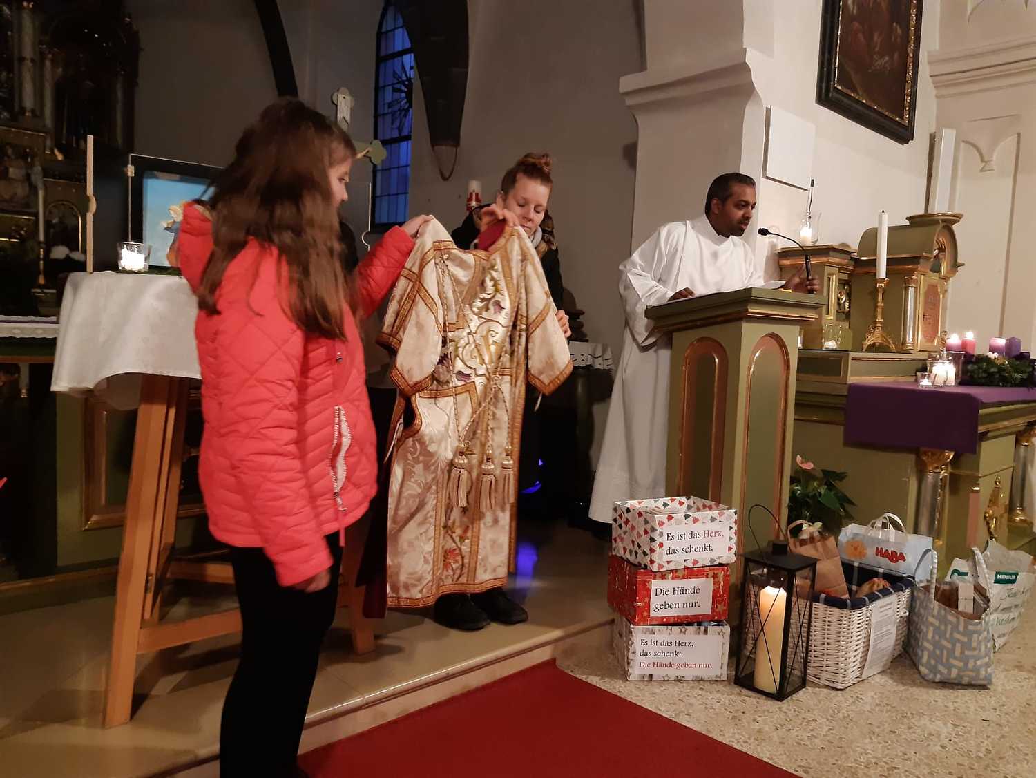 Nach einer kurzen Begrüßung stellten Pfarrer Shinto und Jungscharleiterin Katja den Heiligen Nikolaus vor, in dem sie in Form eines Erzähltheaters eine Geschichte – die Legende der Schiffsrettung - erzählten und anschließend wurde die Kleidung (Bischofsmantel, Mitra, Zingulum, Brustkreuz und Bischofsstab) des Hl. Nikolaus den Kindern erklärt.