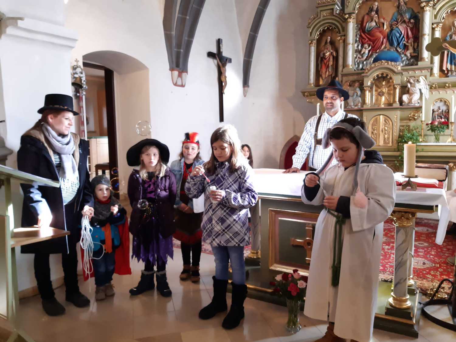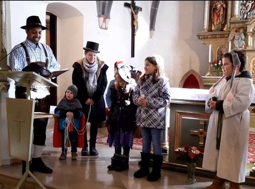 Viele Kinder und auch einige Erwachsenen kamen in ihren lustigen Kostümen um gemeinsam Eucharistie zu feiern. Unser Herr Pfarrer Shinto, der als „Steirerbua“ in Lederhose zum Gottesdienst kam, erzählte uns anstatt der Predigt die Legende vom betenden Gaukler, der er uns gezeigt hat, wie er sein Herz in sein Gebet legte. Seine Art Gott zu loben, danken und ehren sollte für uns alle ein Beispiel sein.