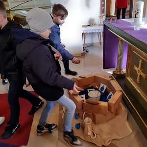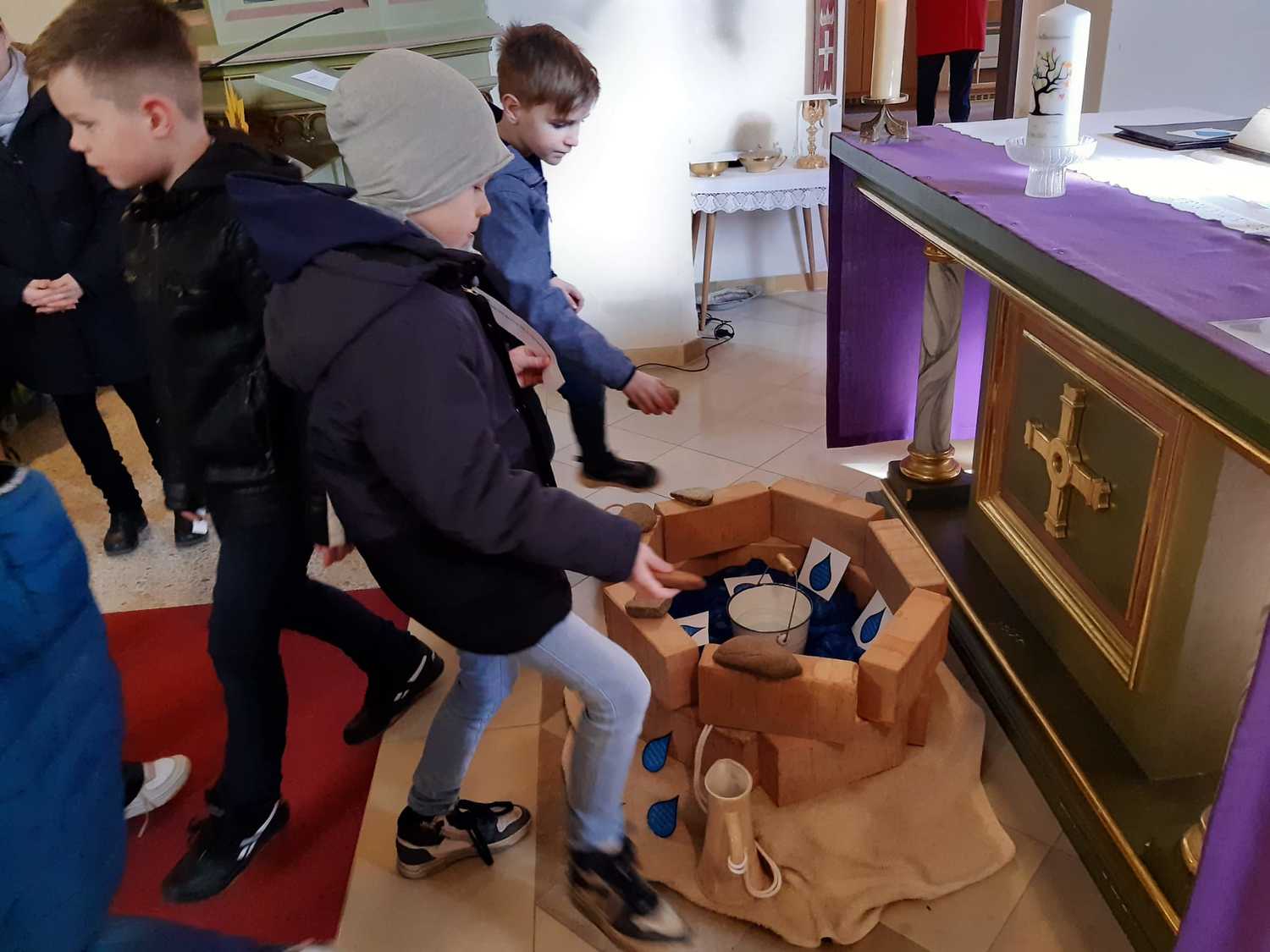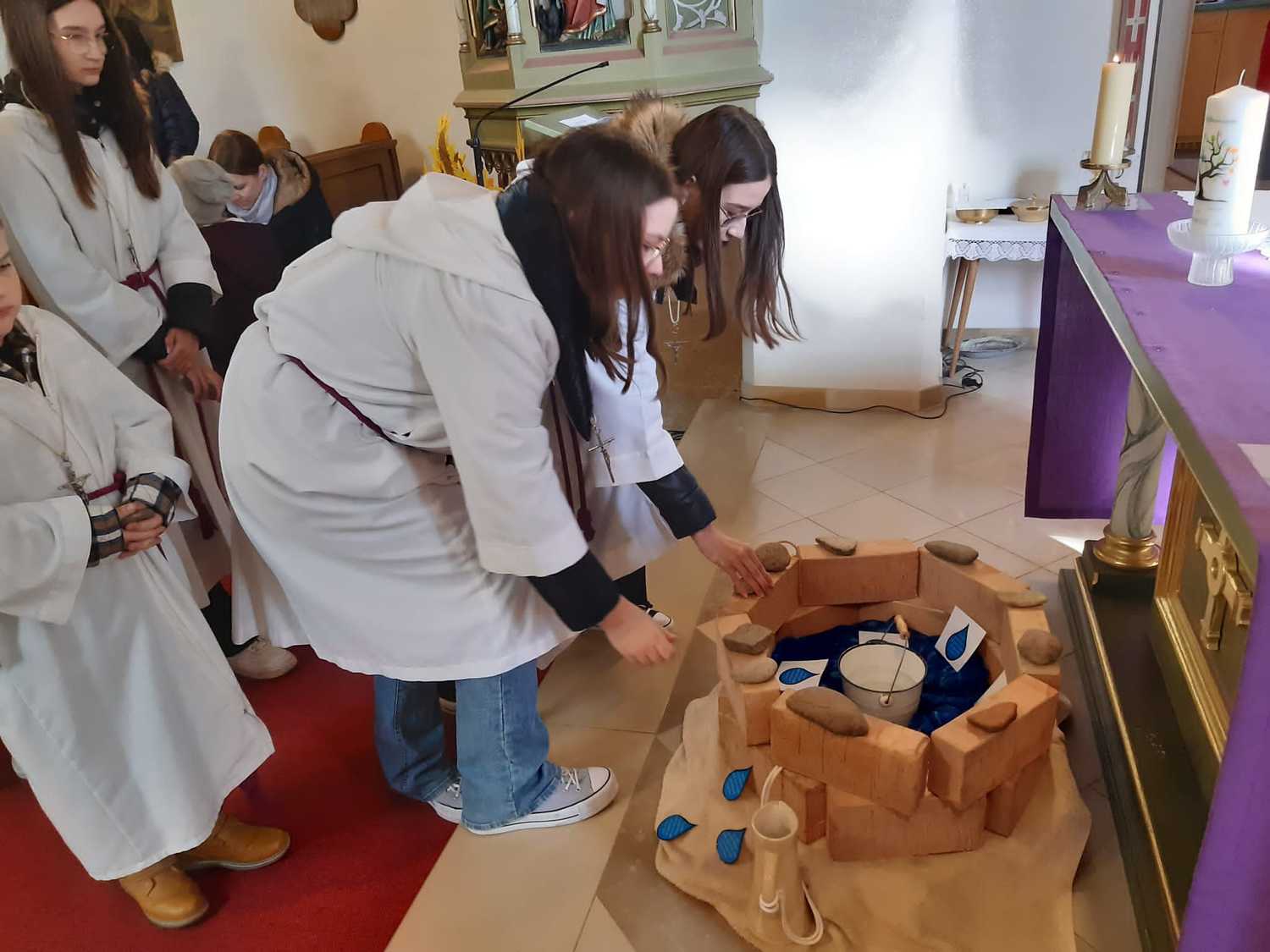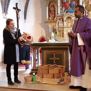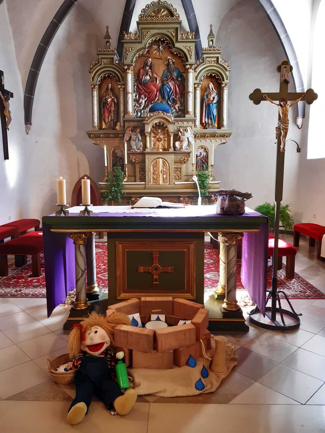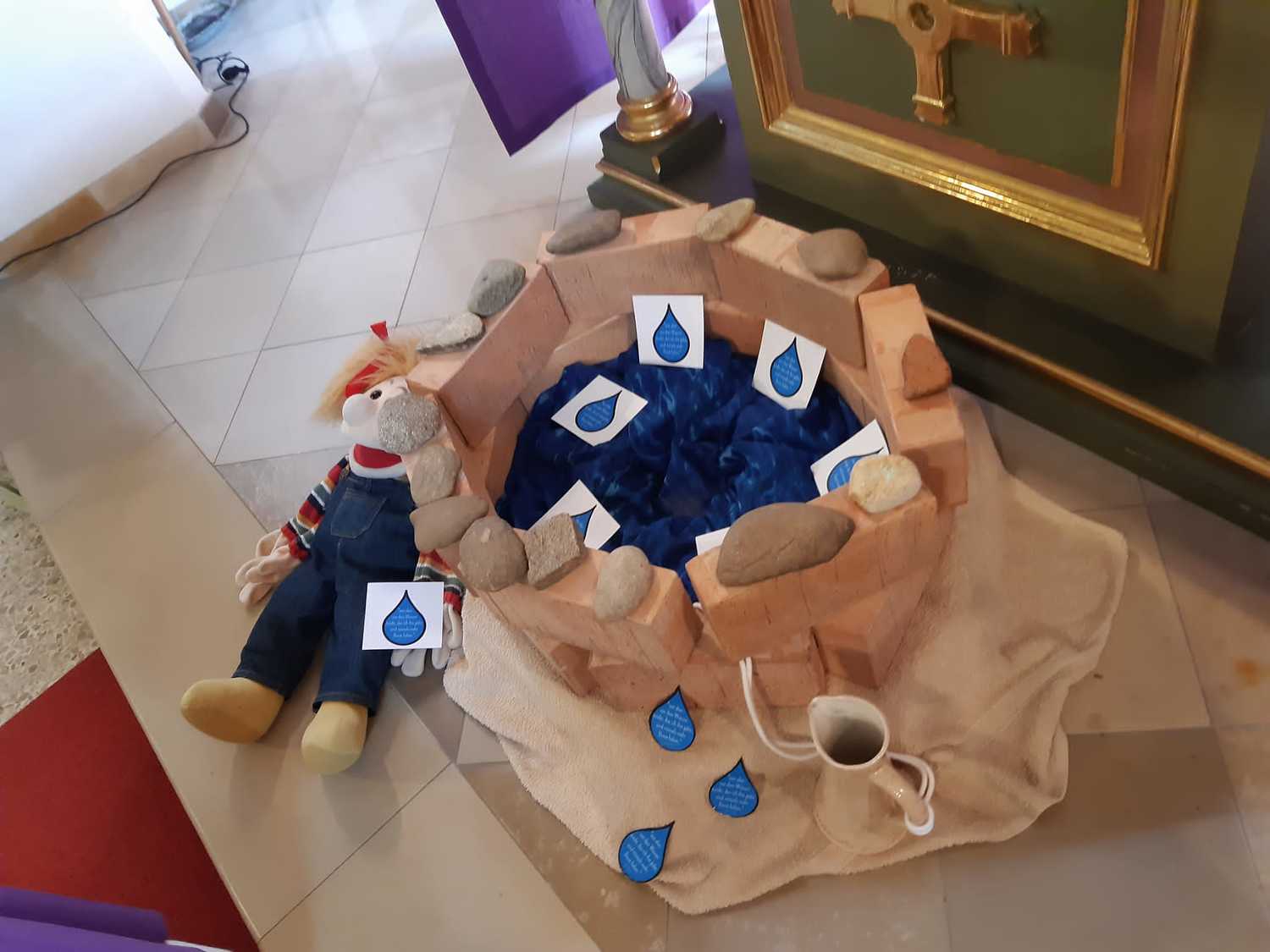 Zu dieser Bibelstelle gestaltete sich am 3. Fastensonntag, 12.März 2023 der Kindergottesdienst und das Thema lebendiges Wasser zog sich wie ein roter Faden durch die Hl.Messe. So bauten die Kinder nach dem Einzug in die Kirche vor dem Altar aus Steinen einen Brunnen, bei dem die Handpuppe Maja bei der Predigt mit Pfarrer Shinto ins Gespräch kam. Dabei wurde so manch offene Frage geklärt, was eigentlich mit lebendigem Wasser gemeint war.
