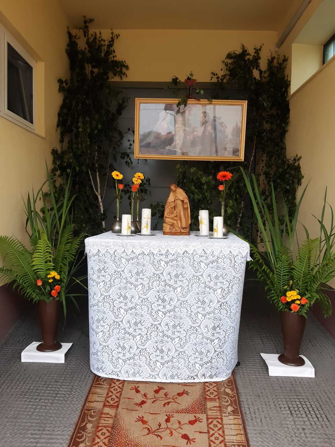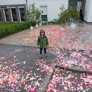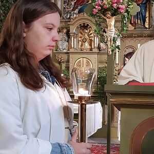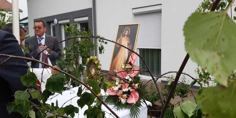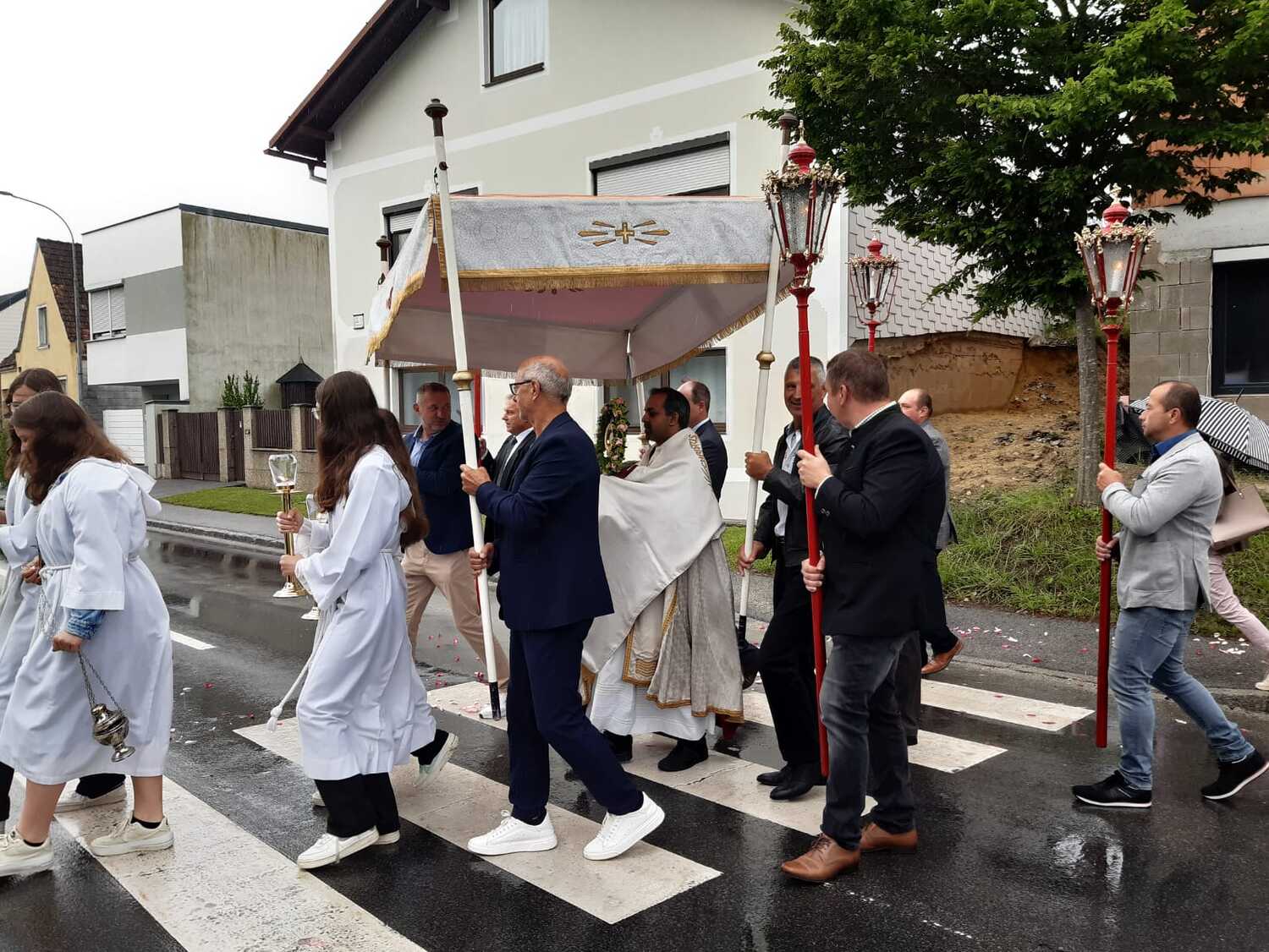 Der Ablauf des Festes musste jedoch wegen des schlechten Wetters kurzfristig geändert werden. Die 1. Station wurde in der Kirche gebetet. Der Weg zum naheliegenden Pfarrheim, wo die 2. Station war, wurde trotz Regen auf sich genommen. Eine besondere Freude hatten die Kinder, die auch ihre Blumen streuen konnten. Die Ministranten und die Erstkommunionkinder haben an beiden Stationen das Vortragen der Fürbitten übernommen.