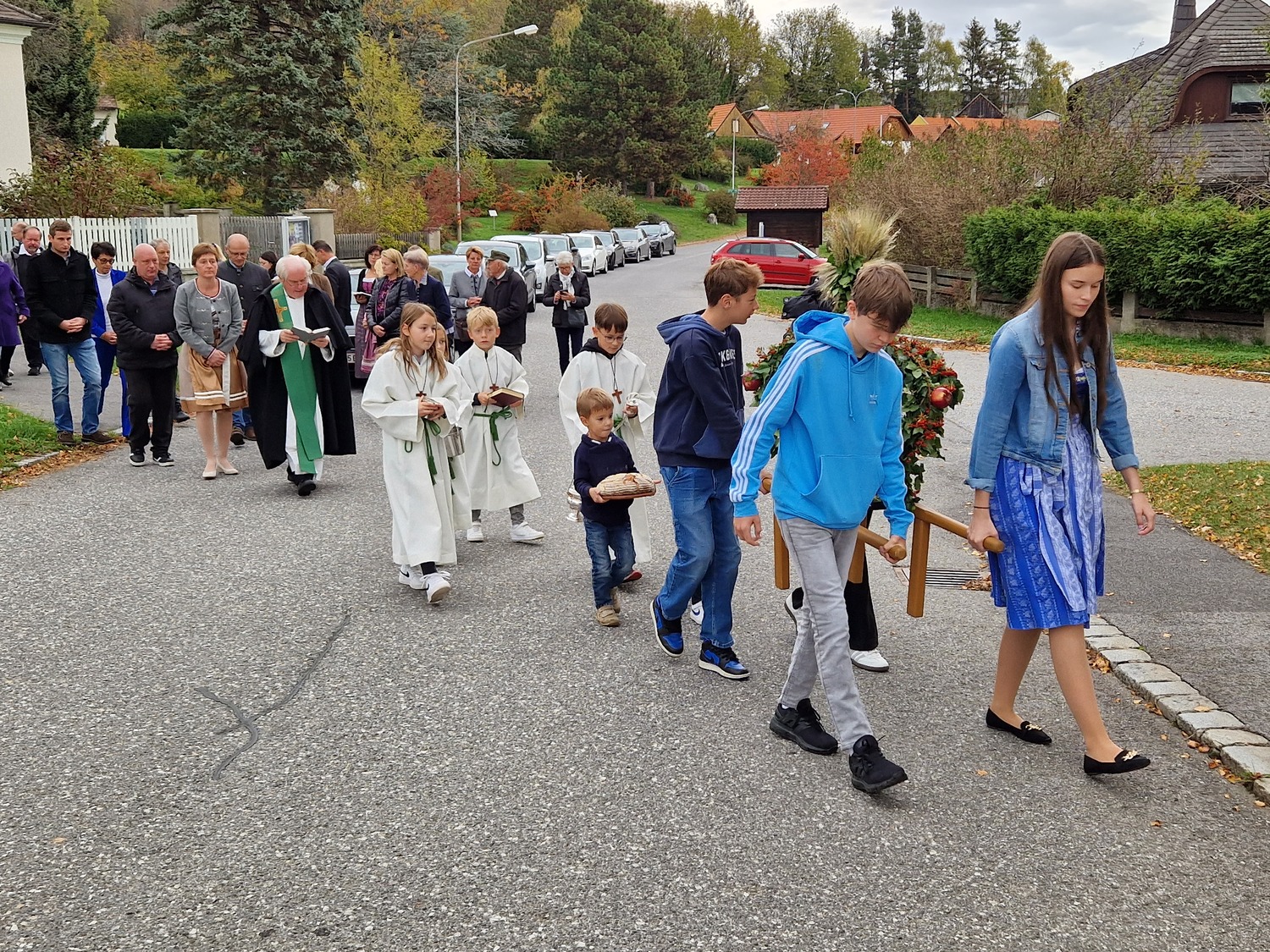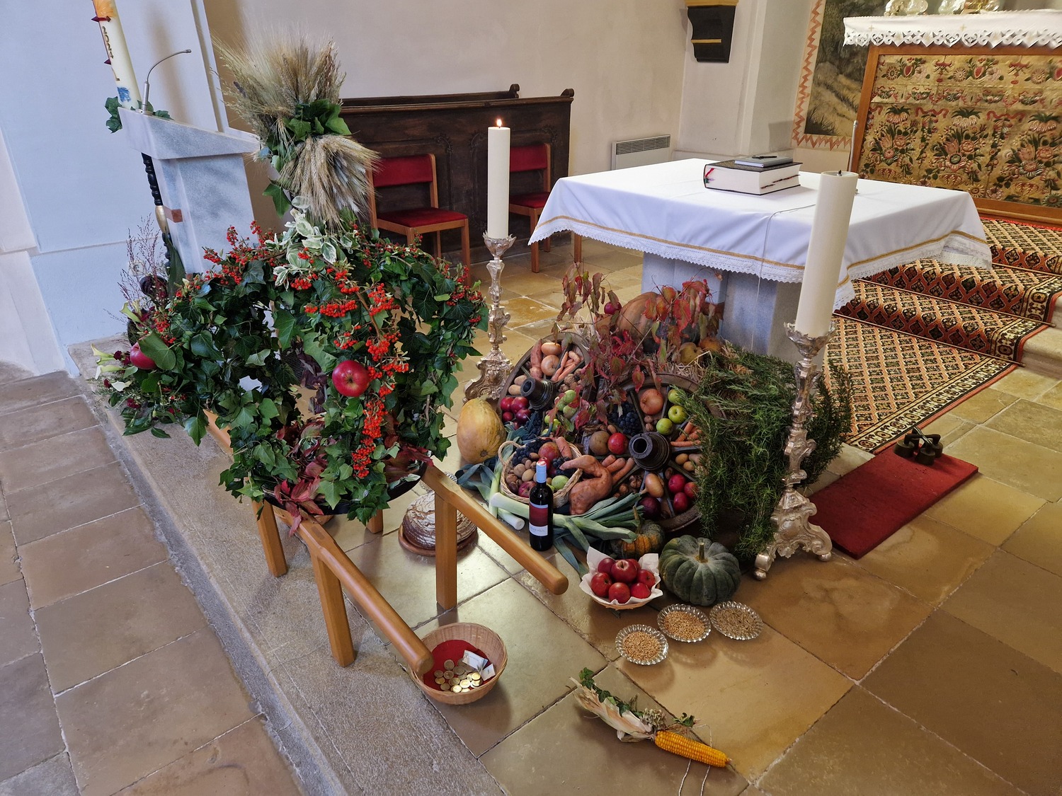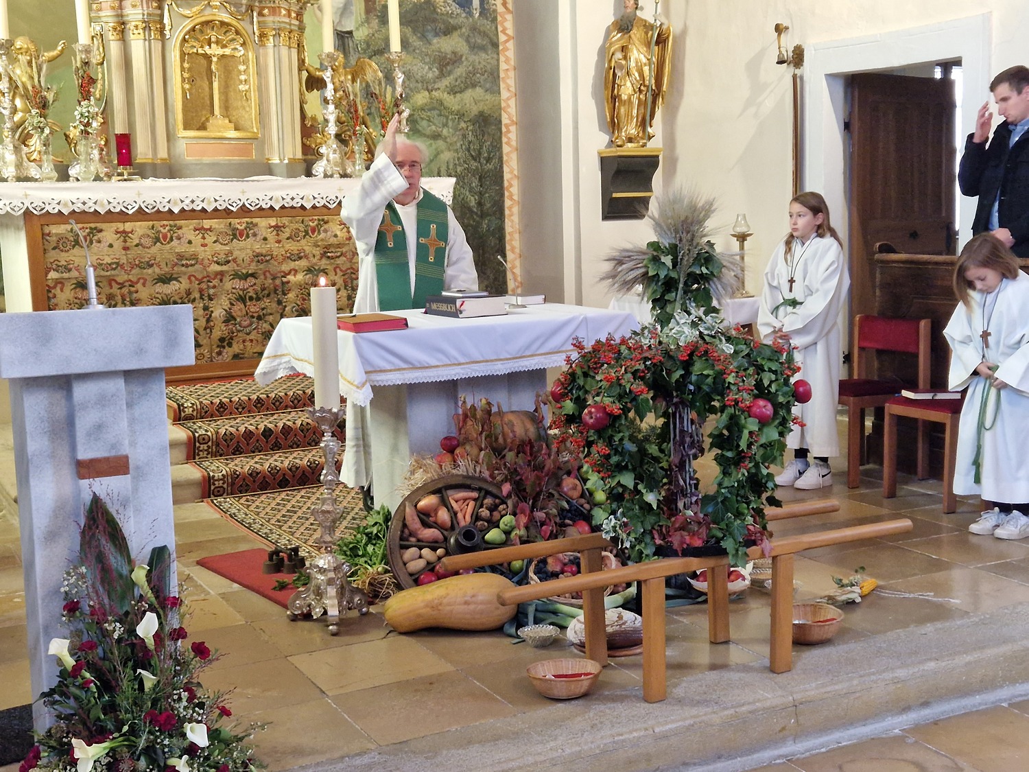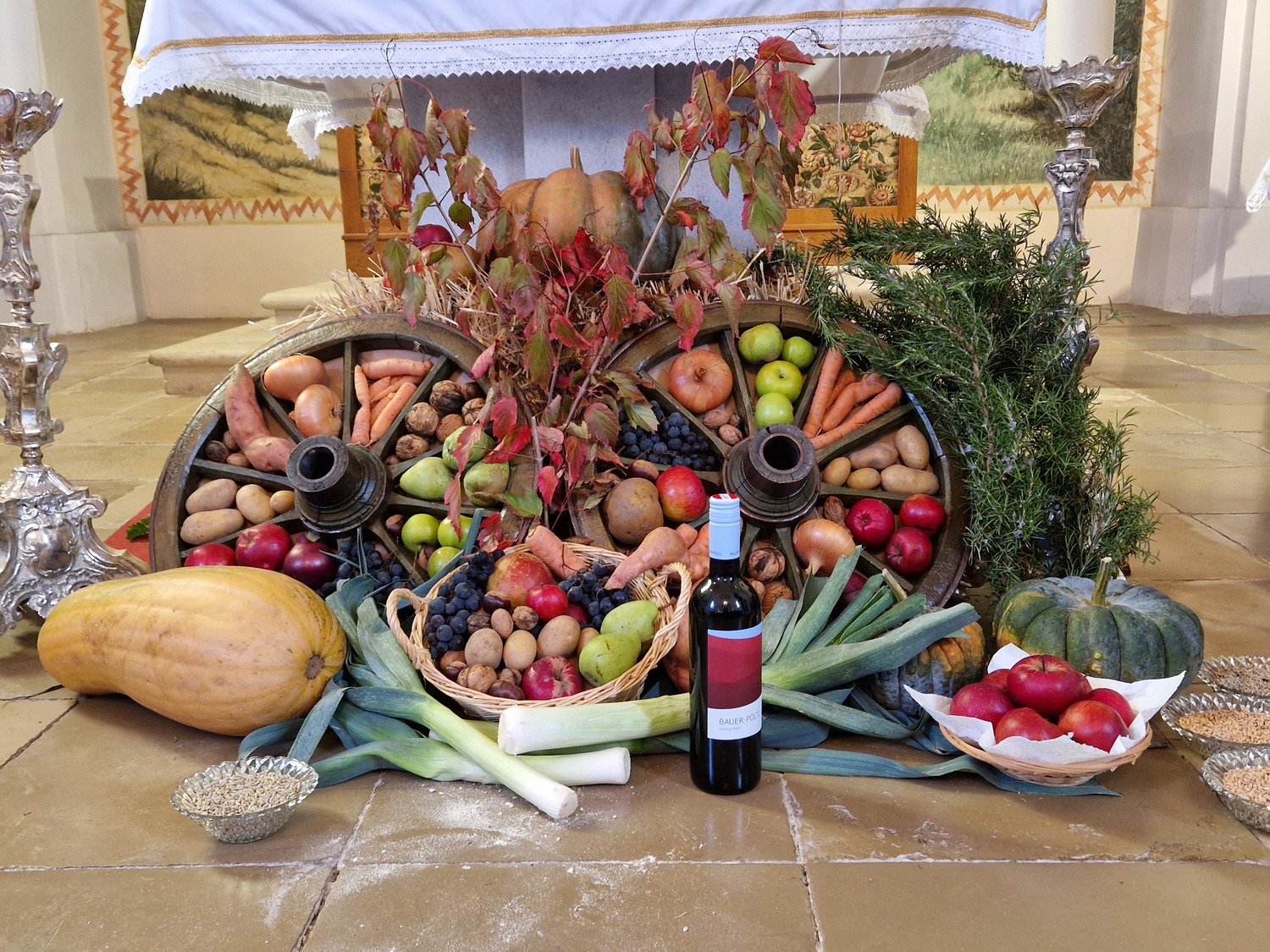 Für die Erntedankfeier wurde die Kirche mit viel Obst und Gemüse geschmückt. Beim feierlichen Einzug mit Erntekrone und Gaben hatten die Kinder und Firmlinge alle Hände voll zu tun. Nach der Eucharistiefeier konnten bei der Agape nette Gespräche geführt werden.