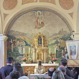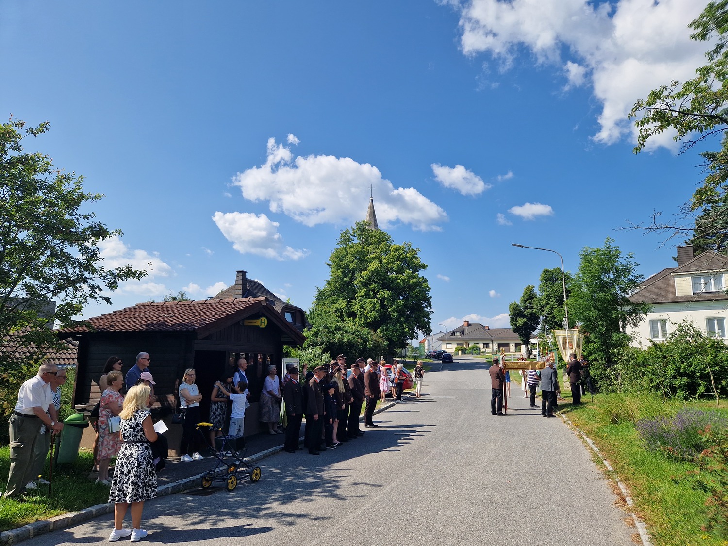 Bei sommerlichen Temperaturen fand nach der Heiligen Messe die Fronleichnamsprozession statt. Die Monstranz wurde durch die Ortschaft getragen und bei zwei Stationen spendete Pfarrer Basil den Eucharistischen Segen.