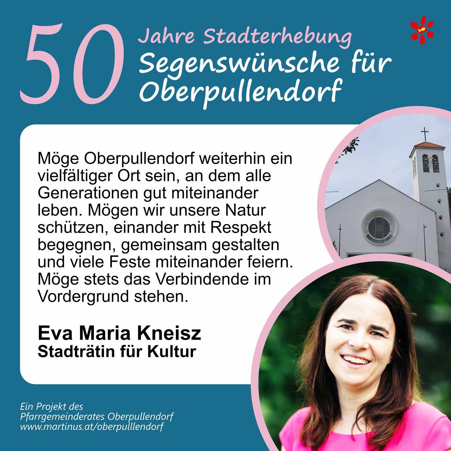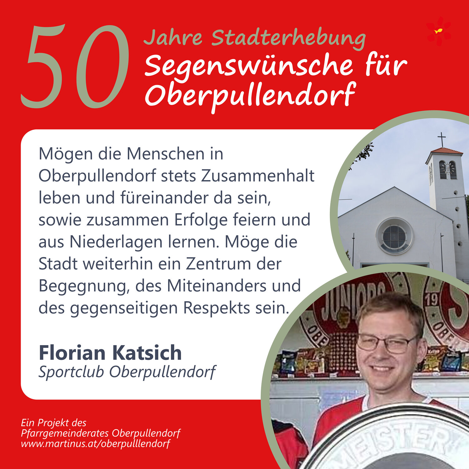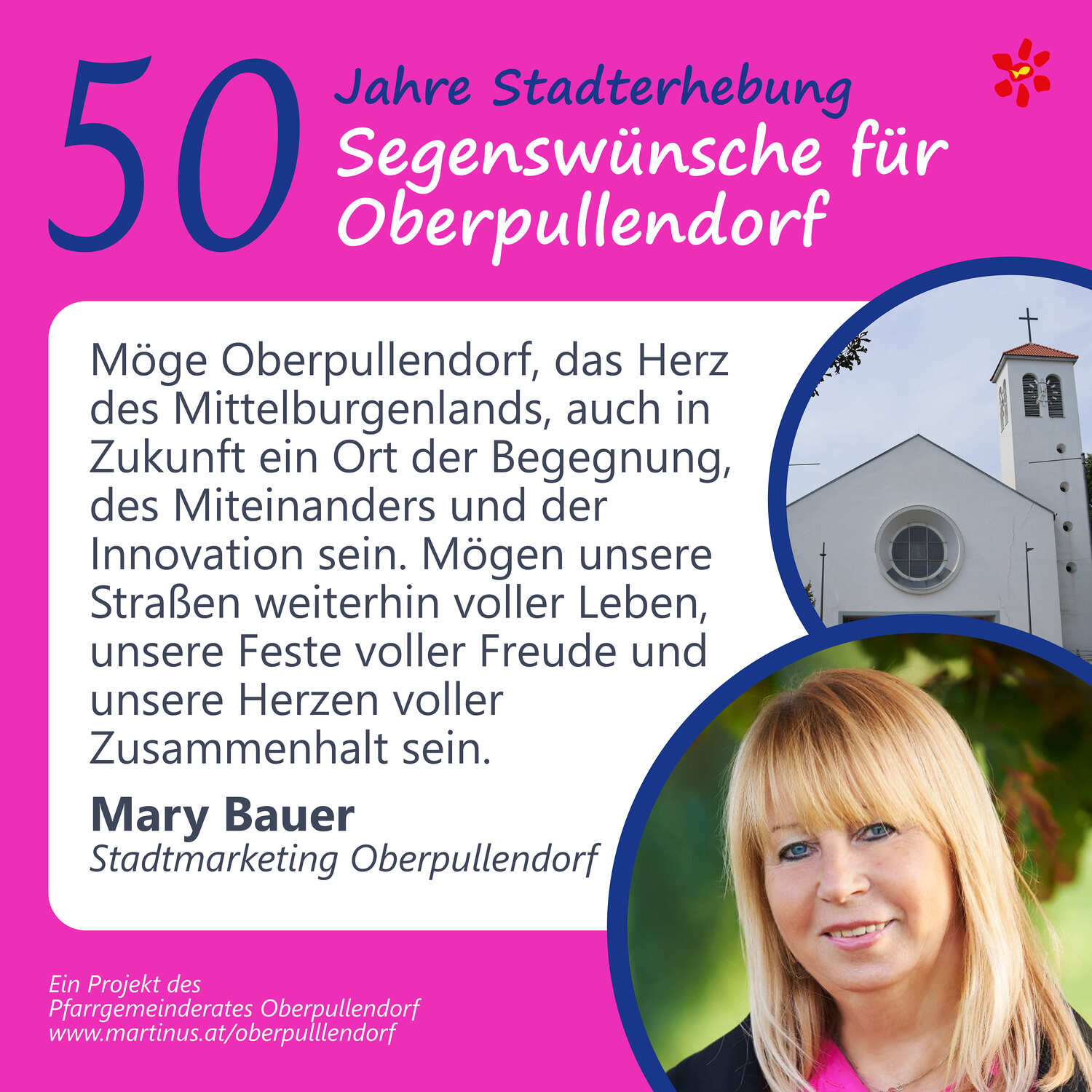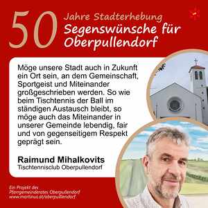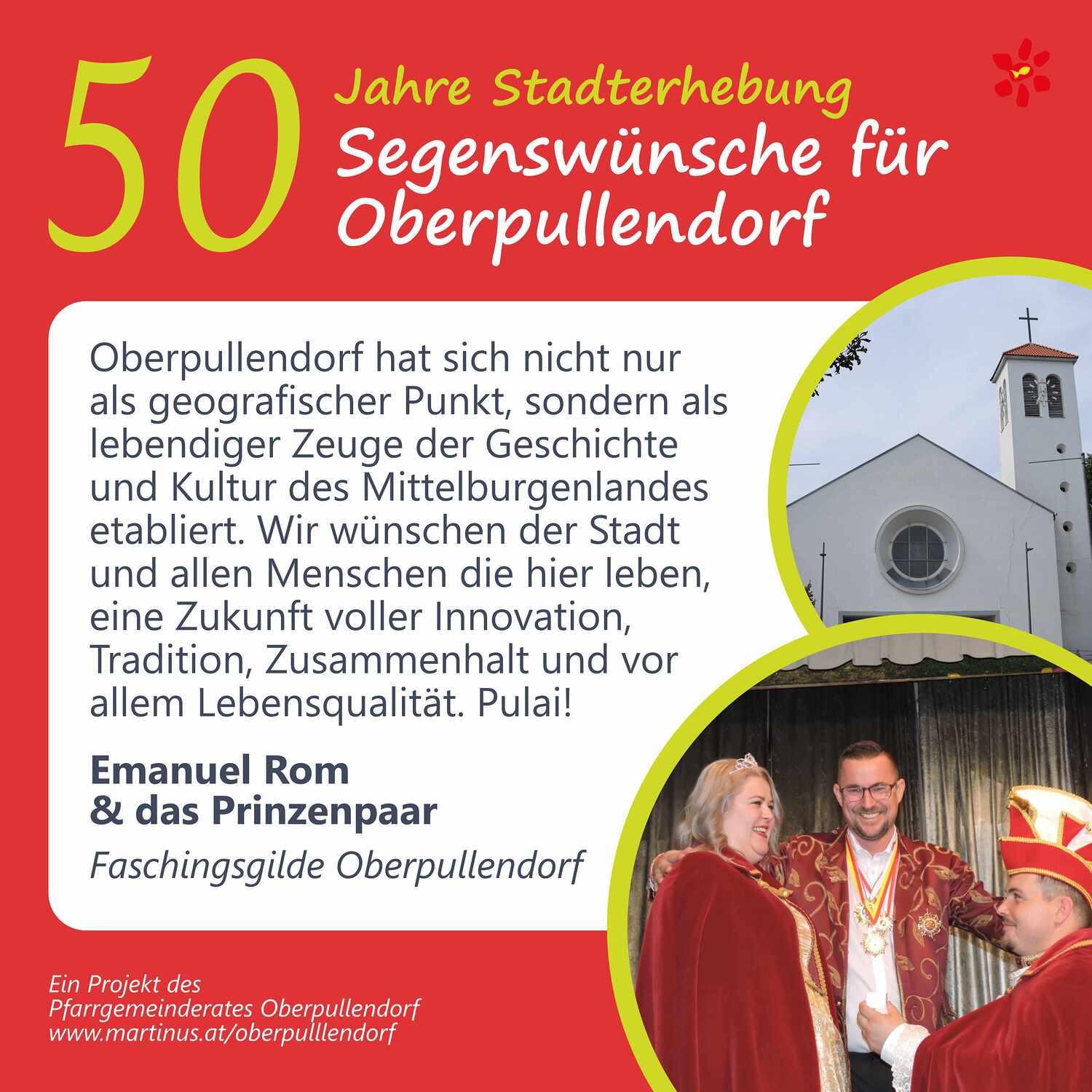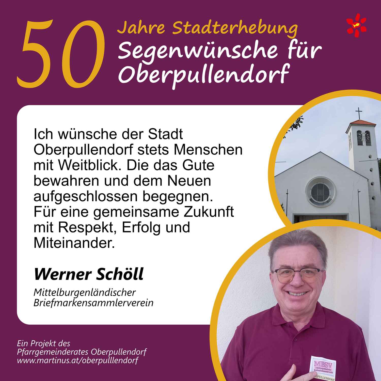 Im Jahr 2025 feierte Oberpullendorf 800 Jahre erstmalige Nennung und 50 Jahre Stadterhebung. Zu diesem Jubiläum hat die Pfarre Oberpullendorf die schöne Tradition aufgegriffen, dass zu Jubiläen dem Jubilar gute Wünsche übermittelt werden.