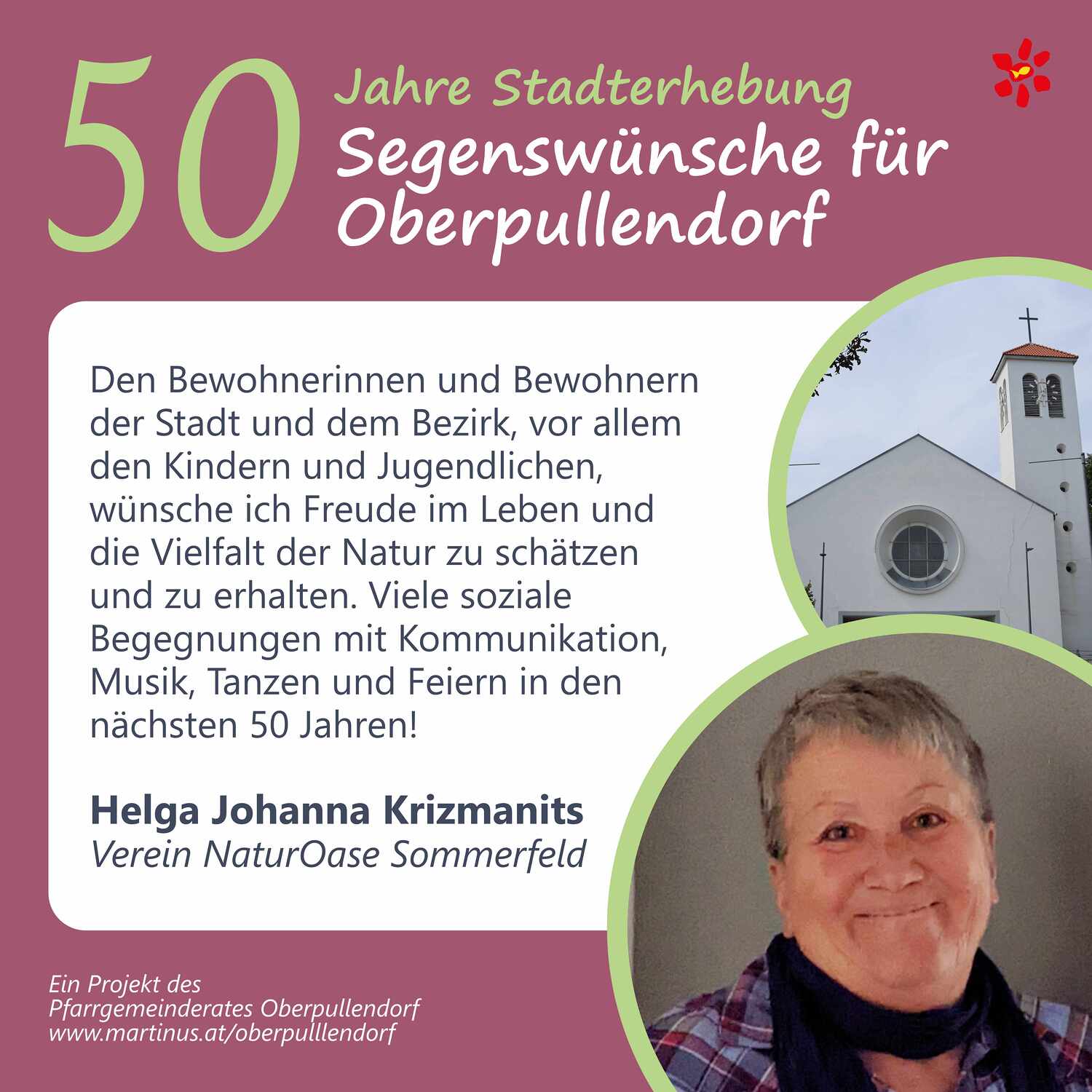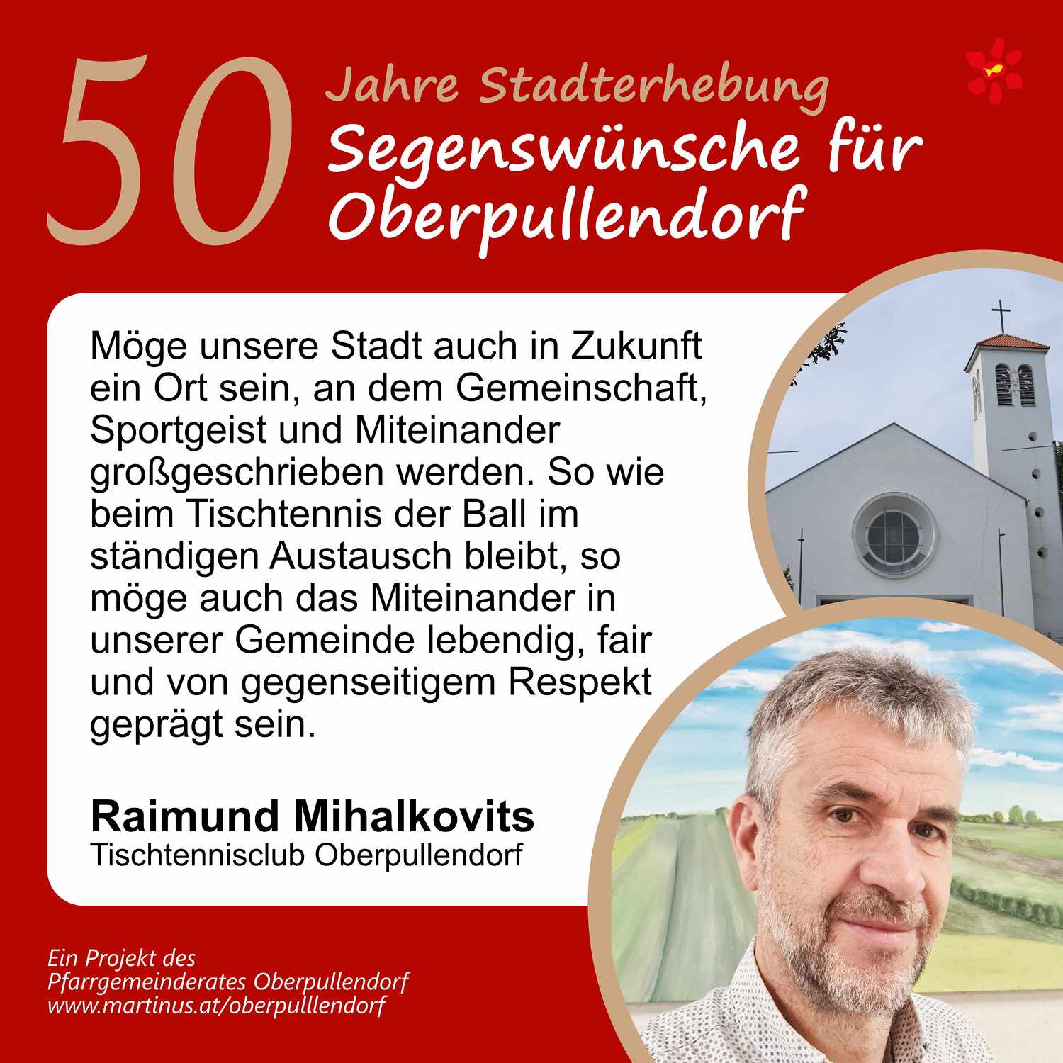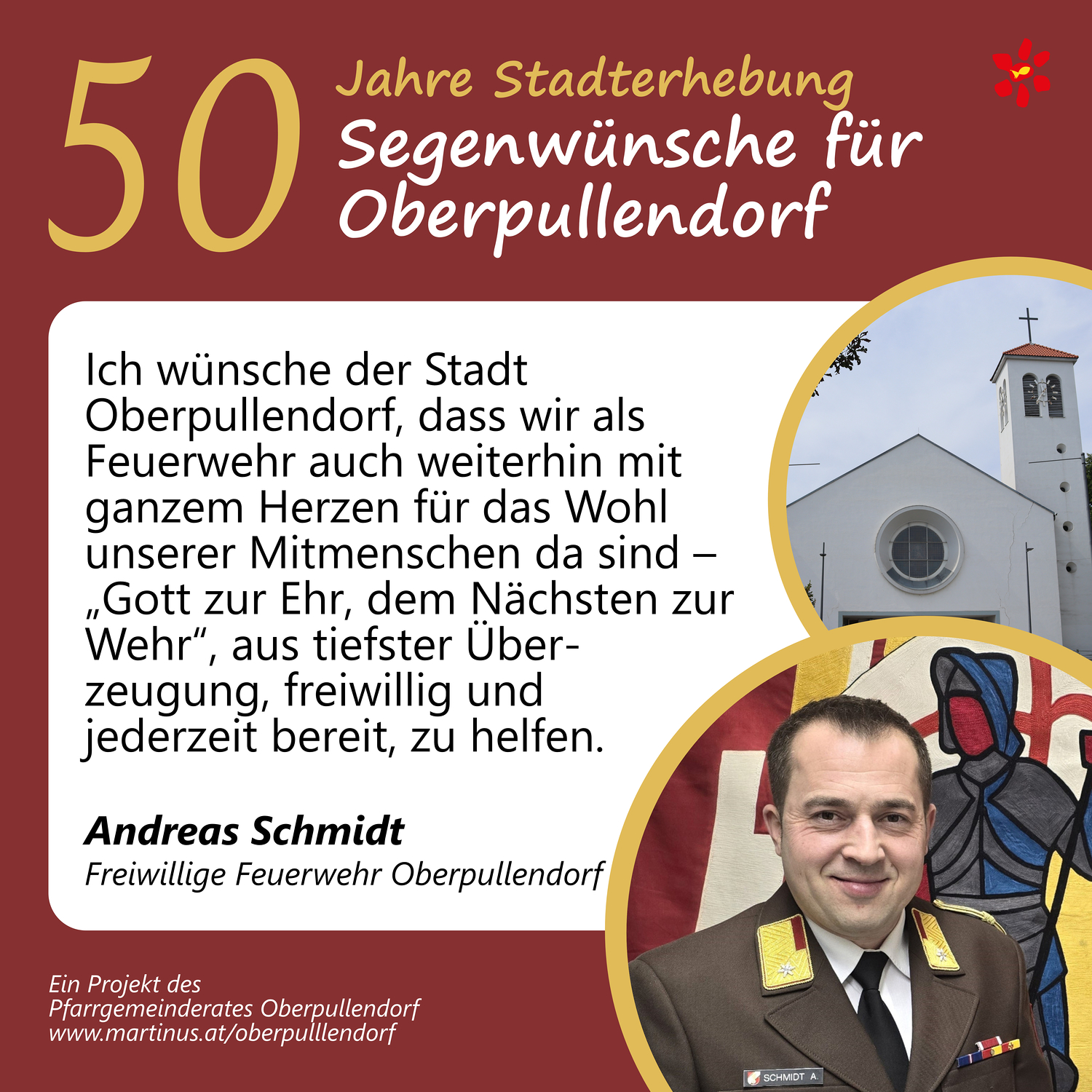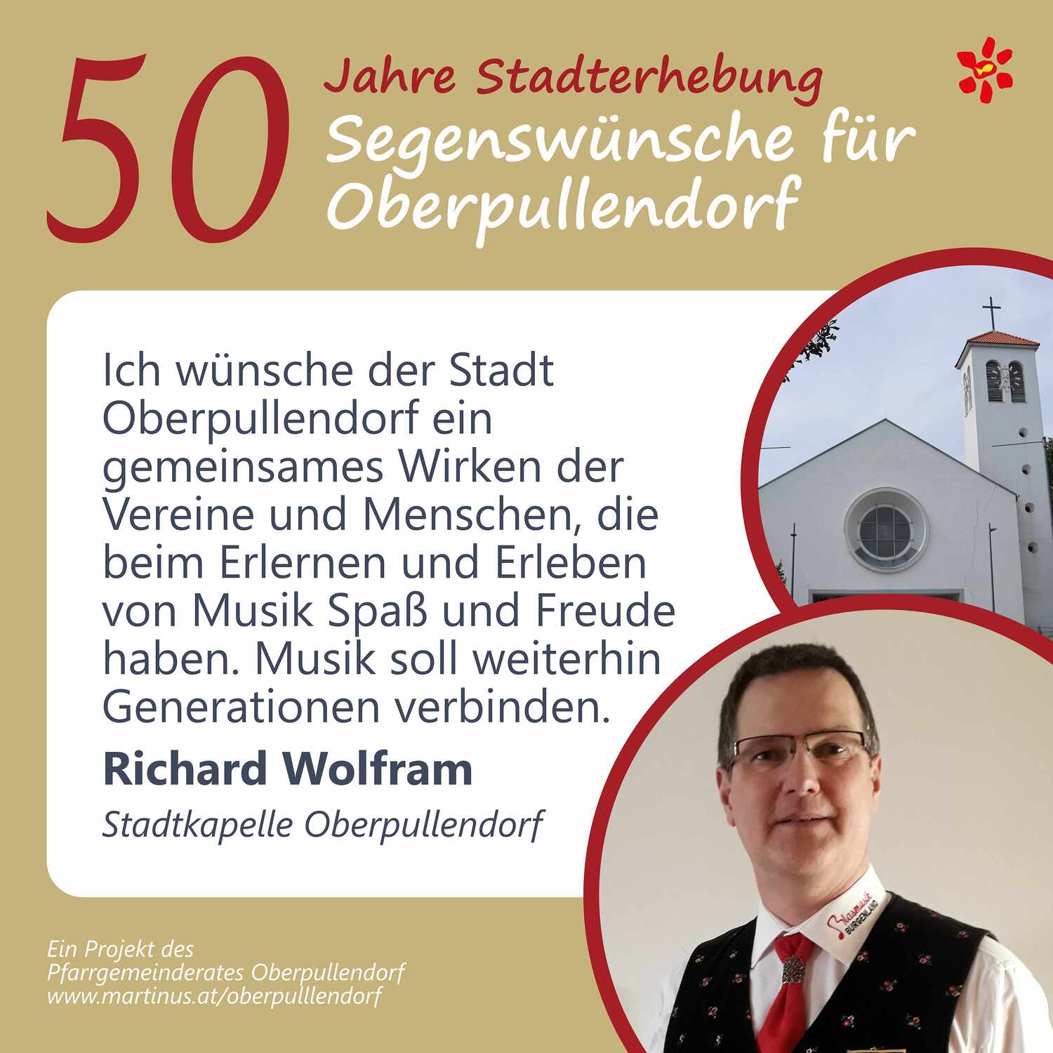 Im Jahr 2025 feierte Oberpullendorf 800 Jahre erstmalige Nennung und 50 Jahre Stadterhebung. Zu diesem Jubiläum hat die Pfarre Oberpullendorf die schöne Tradition aufgegriffen, dass zu Jubiläen dem Jubilar gute Wünsche übermittelt werden.
