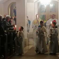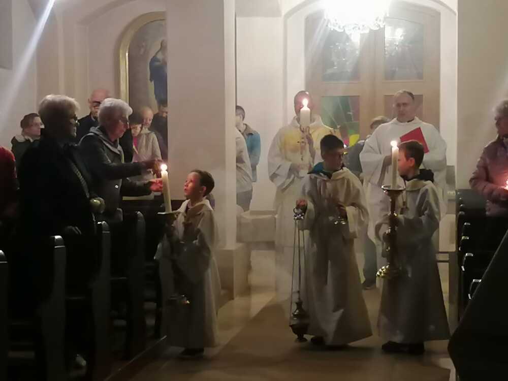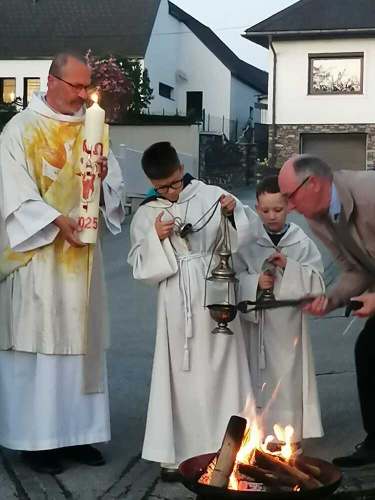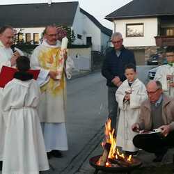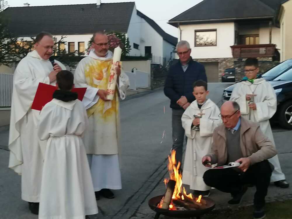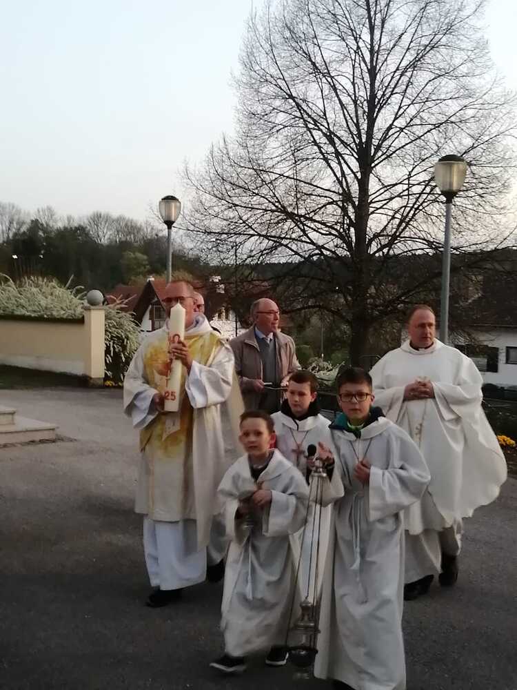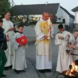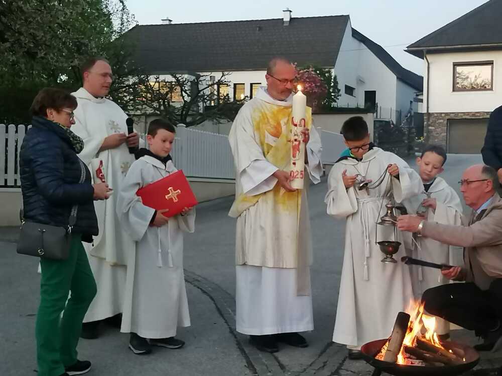 Am Karsamstag feierten Kaplan Andreas Gold und Diakon Rudolf Exel gemeinsam in der Pfarre Grafenschachen die Osternacht. Beginn der Liturgie war beim Osterfeuer vor der Kirche, wo auch die neue Osterkerze entzündet wurde.