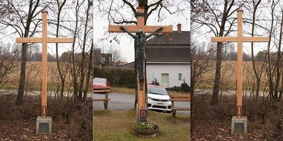 Neues Holzkreuz für das Kruzifix bei der alten Kirche und neues Firmlingskreuz