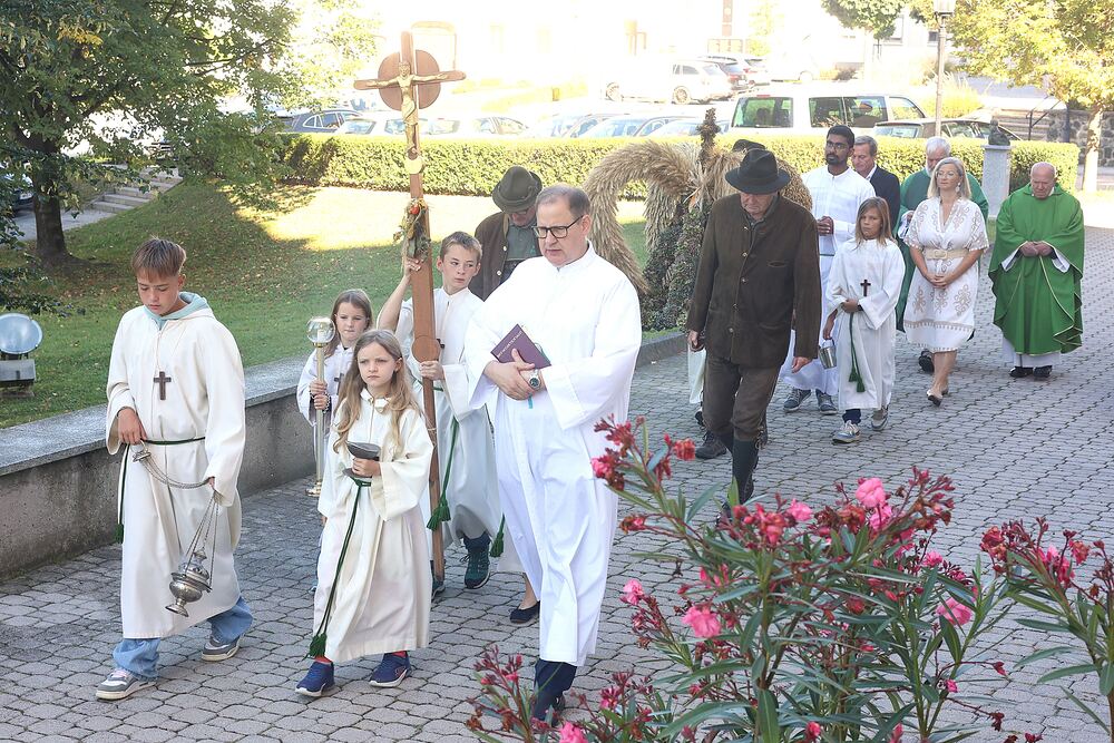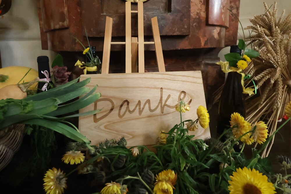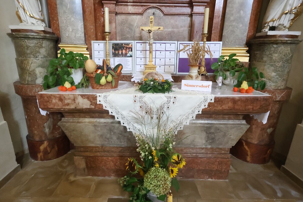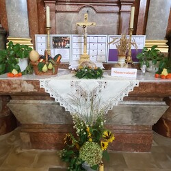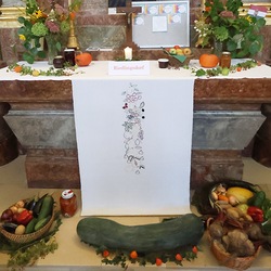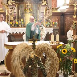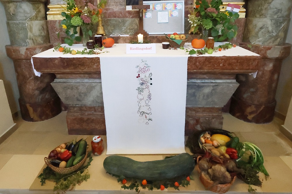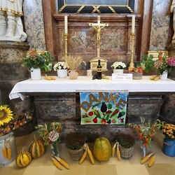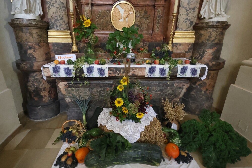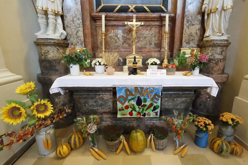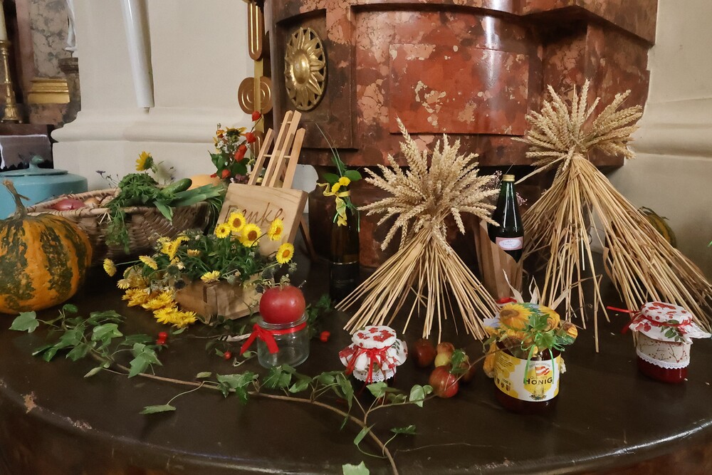 Wer am 21. September in die Kirche kam, war umgeben von herrlicher, liebevoller Dekoration aus Früchten, Blumen und Gemüse. Die Erntekrone war auch beeindruckend und so wurde bei der Erntedankmesse Gott aus ganzem Herzen für all die Fülle gedankt. Anschließend fand bei strahlendem Wetter ein gemütliches Beisammensein mit warmen Speisen, Getränken und Mehlspeisen statt. Die Kinder konnten Erntedankkränze und Sonnen basteln und das freie Spiel auf der Wiese genießen.