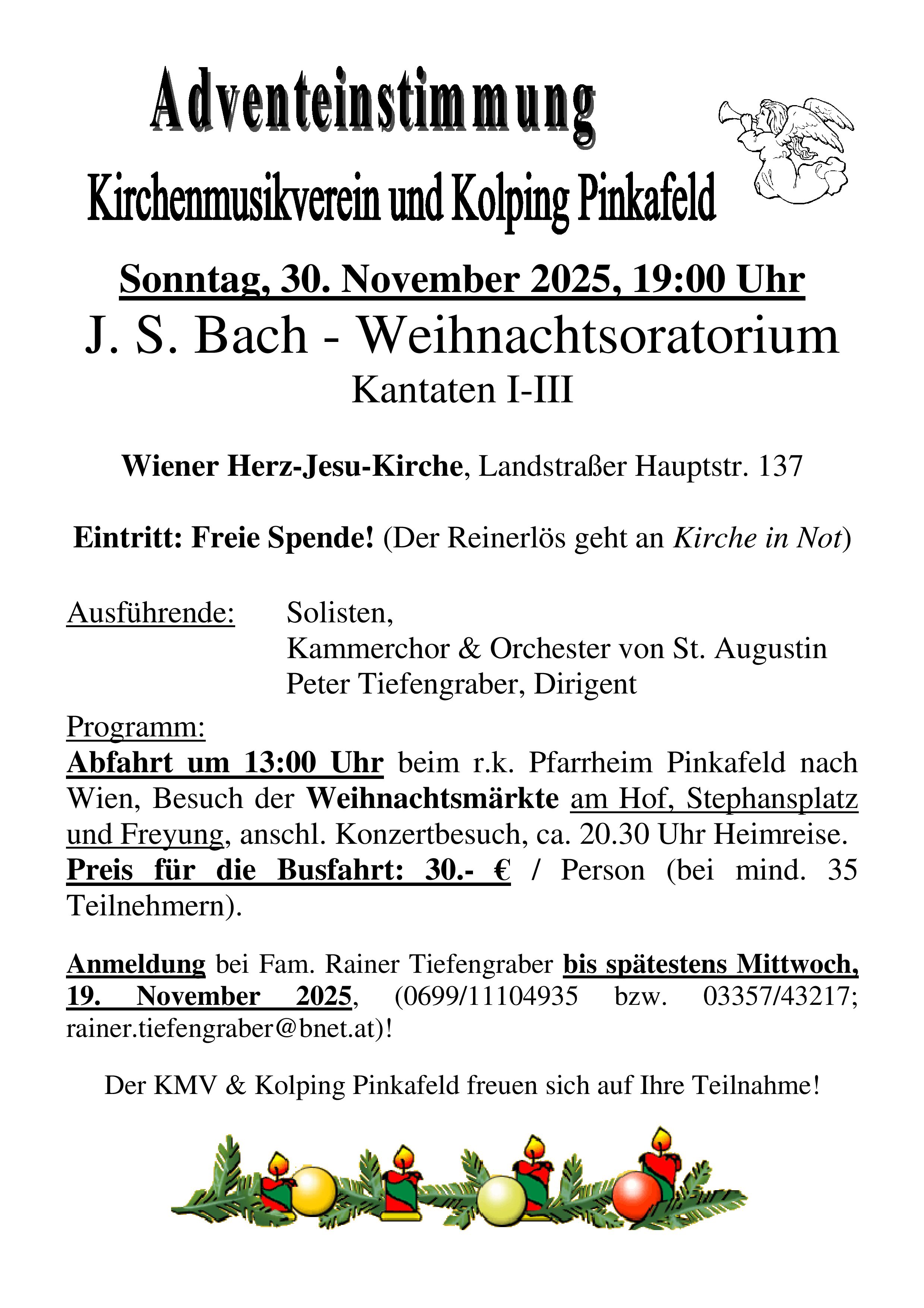 Programm: Abfahrt um 13 Uhr beim r.k. Pfarrheim Pinkafeld nach Wien. Dort zuerst Besuch der Weihnachtsmärkte am Hof, Stephansplatz und Freyung, anschließend Konzertbesuch. Heimreise um ca. 20:30 Uhr.