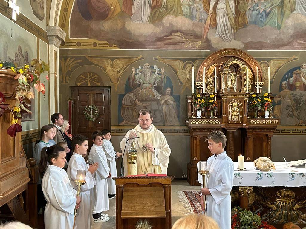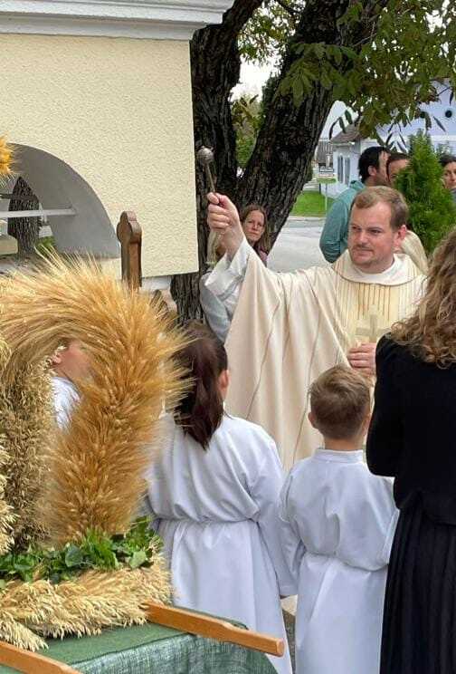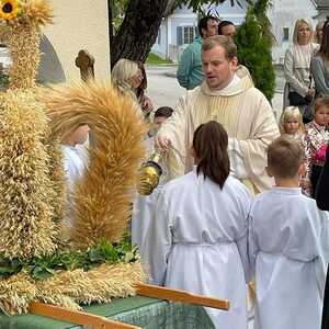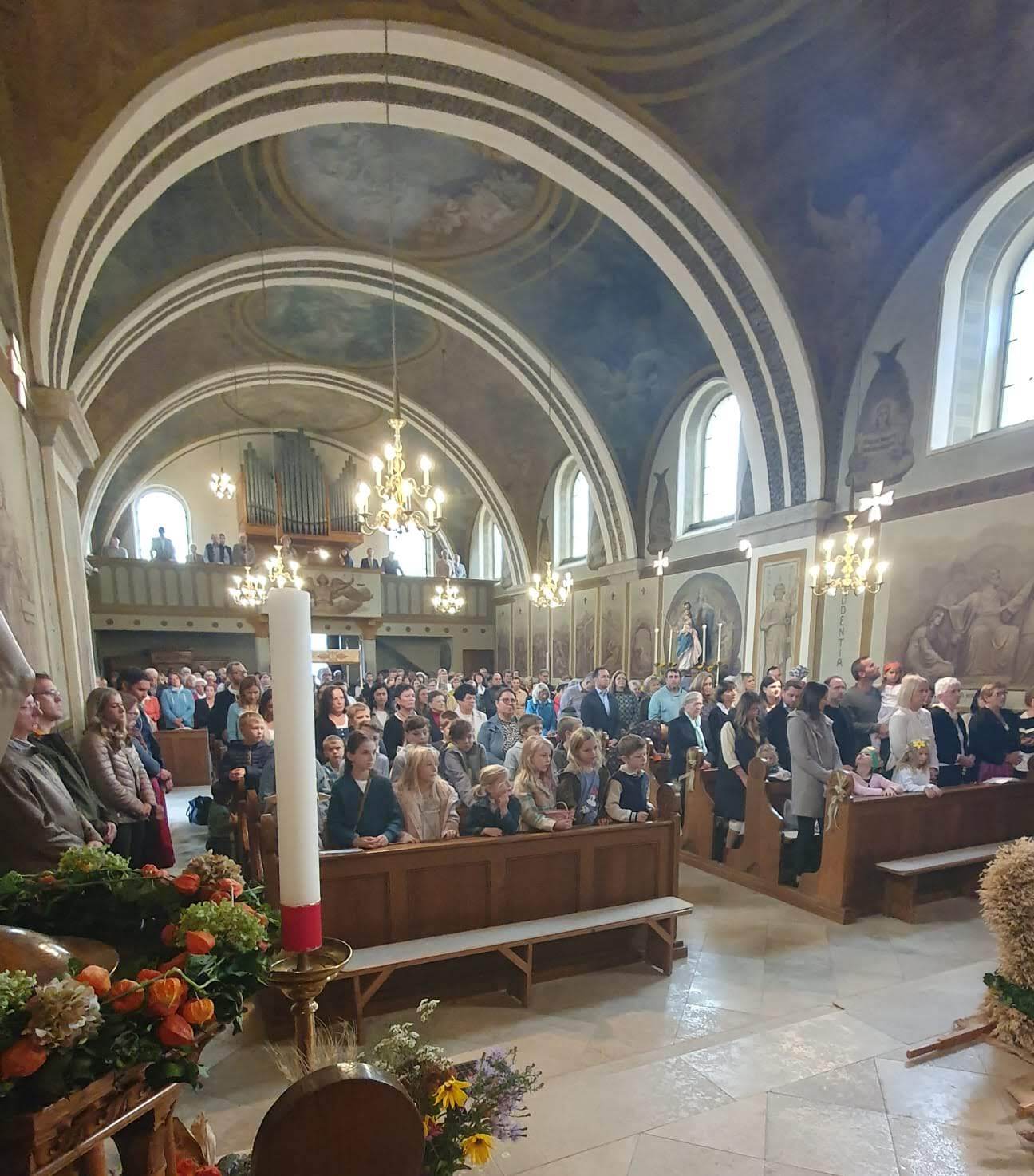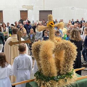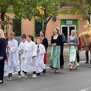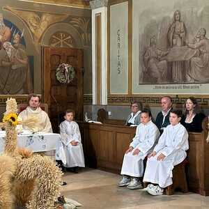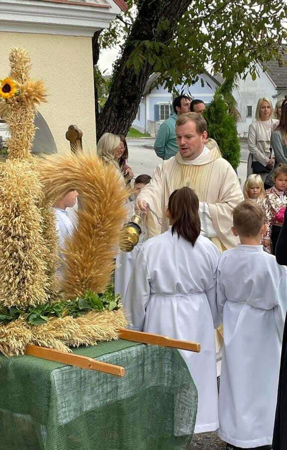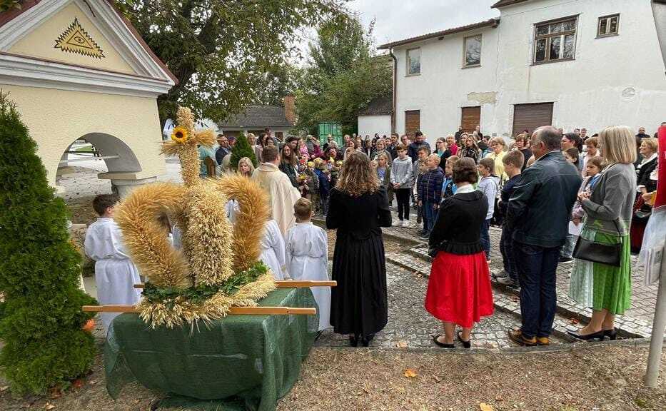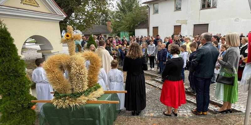 Am Sonntag, 8. Oktober feierte die Pfarre St. Michael ihr Erntedankfest. Traditionell wurde bei der Kapelle Bergstraße begonnen, wo die Kindergartenkinder mit ihren Päagoginnen ein passendes Gedicht und Lied als Einstimmung zur Segnung der Erntekrone und -gaben in die Feier einbrachten. Die Festmesse in der Pfarrkirche wurde von den Erstkommunionkinder des heurigen Schuljahres mitgestaltet. In seiner Predigt verglich unser Herr Pfarrer die Feld- und Gartenfrüchte mit den geistlichen Früchten in unserem Leben und ermutigte dazu, süße und gehaltvolle Früchte hervorzubringen - nicht saure oder verdorbene. Dazu bedürfe es der Kenntnis um geistliche Früchte und um ihre rechte Pflege und Hege.