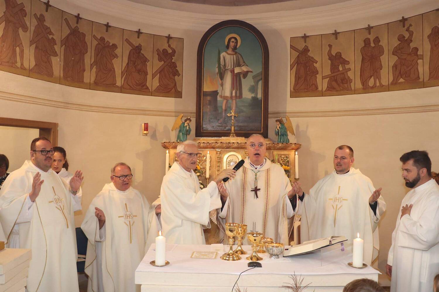 Ein großes Festzelt, das eigens für den Festgottesdienst aufgestellt worden ist und bereits am Nachmittag wieder zur Freigabe der Straße abgebaut war, wurde dank Videoübertragung zum erweiterten Kirchenraum, in dem zahlreiche Gläubige unseres Seelsorgeraums (und darüber hinaus) die Festmesse mitfeiern konnten und auch vor dem einsetzenden Regen geschützt waren. Trotz der langen Feier mit seiner Fülle an besonderen Riten ließen es sich viele nicht nehmen, noch zu einer Agape bei guter Stimmung zusammenzubleiben.
