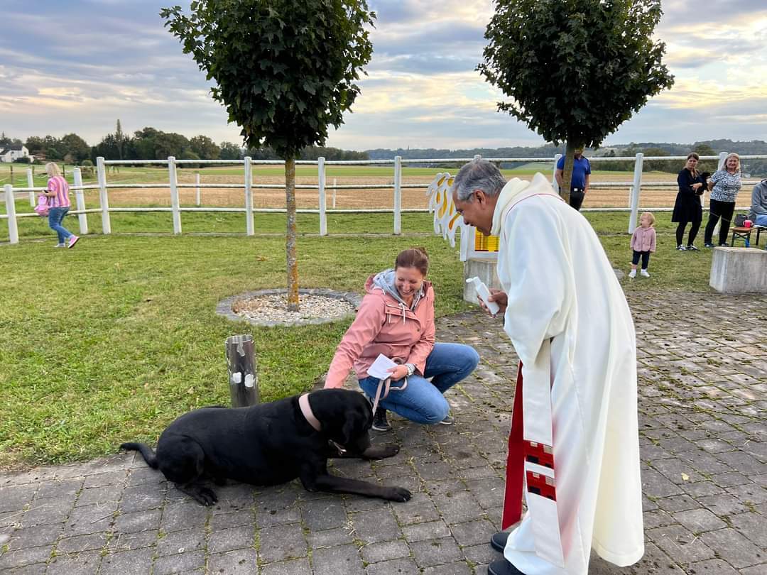 Hunde, Katzen, Hühner, Pferde, ein Pony, eine Gottesanbeterin und jede Menge Kuscheltiere wurden am Welttierschutztag von Pfarrer Thomas Vayalunkal gesegnet.