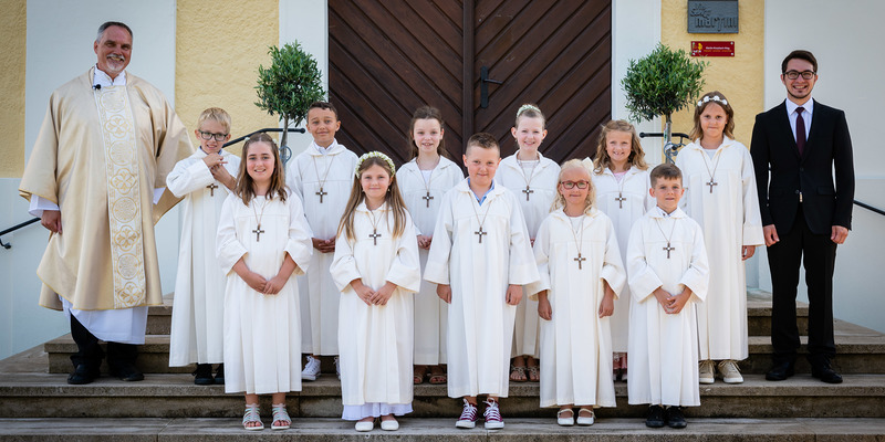 Bei strahlendem Sonnenschein feierten am Pfingstmontag elf Kinder aus der Pfarre St. Martin/Raab das Fest ihrer Erstkommunion. Nach pandemiebedingter Pause konnte wieder ein festlicher Einzug der Kinder und ihrer Taufpaten vom Pfarrheim zur Kirche begleitet vom Musikverein gehalten werden.